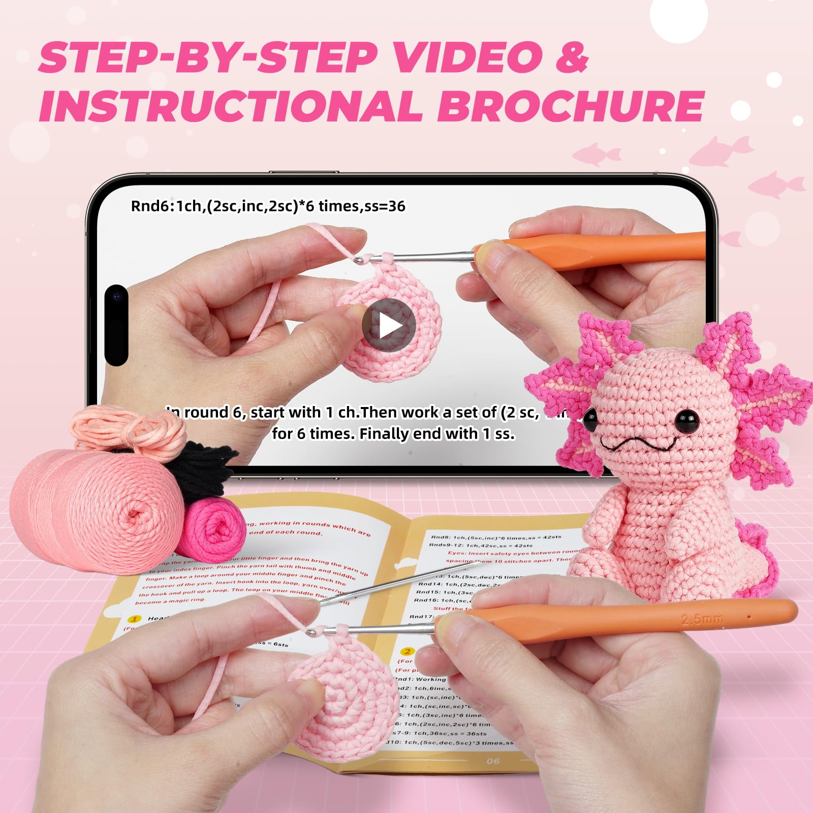 Crochet Kit for Beginners, Crochet Animal Kits,Crocheting Kit for Starters with Step-by-Step Video Tutorials, Beginner Crochet Kit for Adults (Axolotl 1Pack)