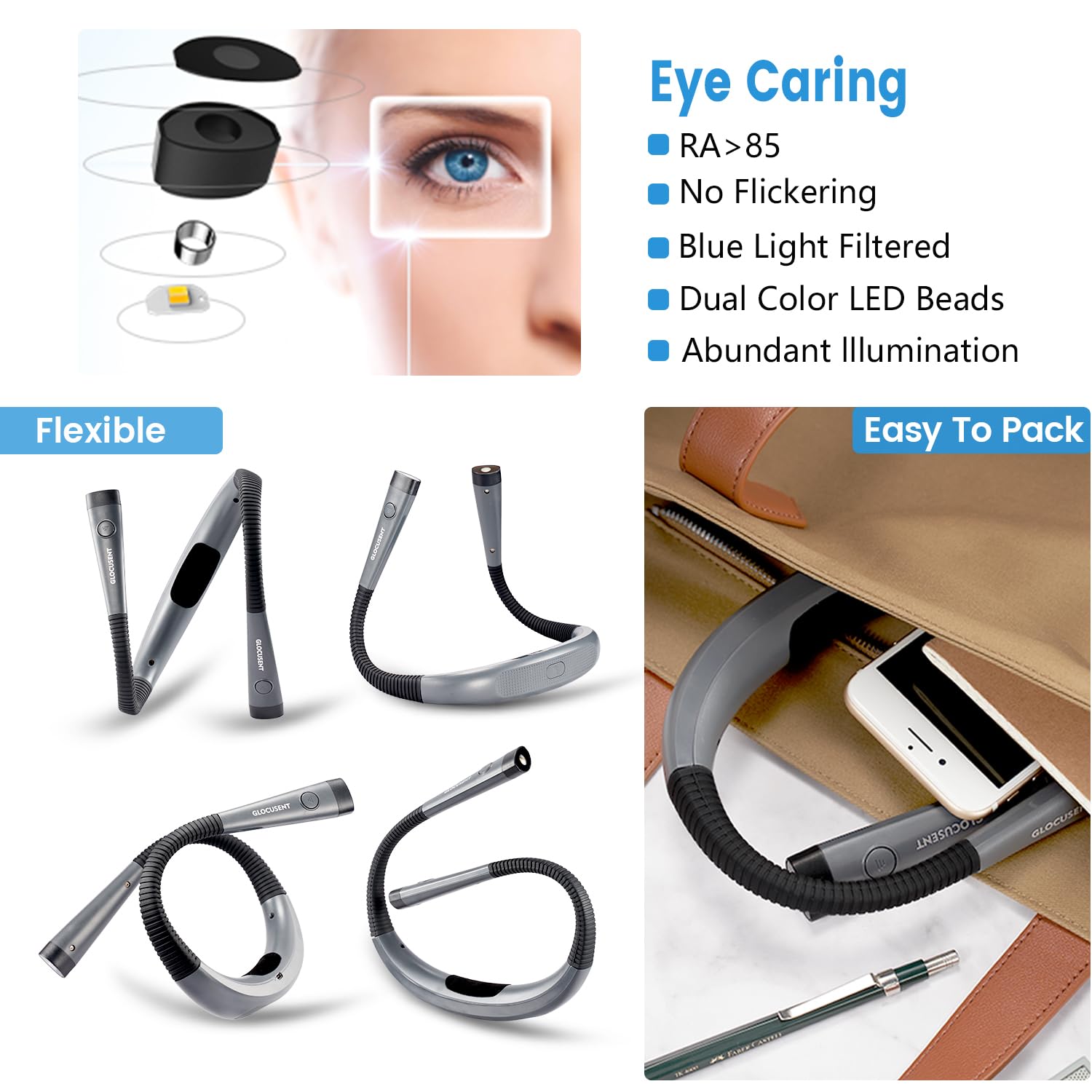 - [3 Color & 6 Brightness Adjustable] This Glocusent reading light owns 3 useful color temperature modes: yellow(3000K), warm white(4000K) and cool white(6000K). Each neck light head owns an independent switch for 3 brightness levels dimmable. The perfect neck light for crocheting and reading light for bed, knitting, camping, or repairing etc.