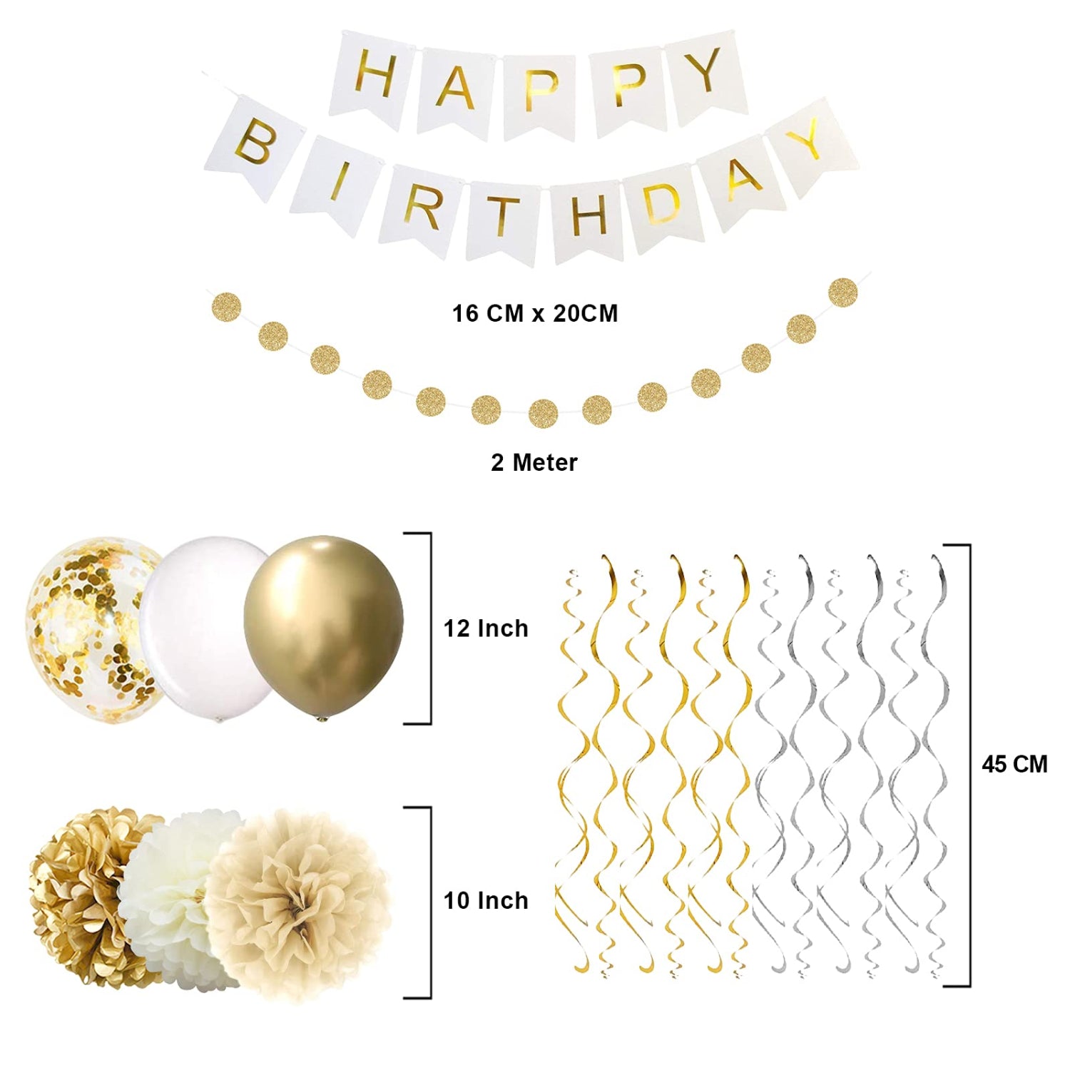 - Value Pack: includes "HAPPY BIRTHDAY" banner (1set), gold dot paper garland, metallic gold latex balloons(6pcs), white latex balloons(9pcs), pre-filled gold confetti balloon(6pcs), flower pompoms(6pcs total) , gold hanging swirls (6pcs), silver hanging swirls(6pcs)
