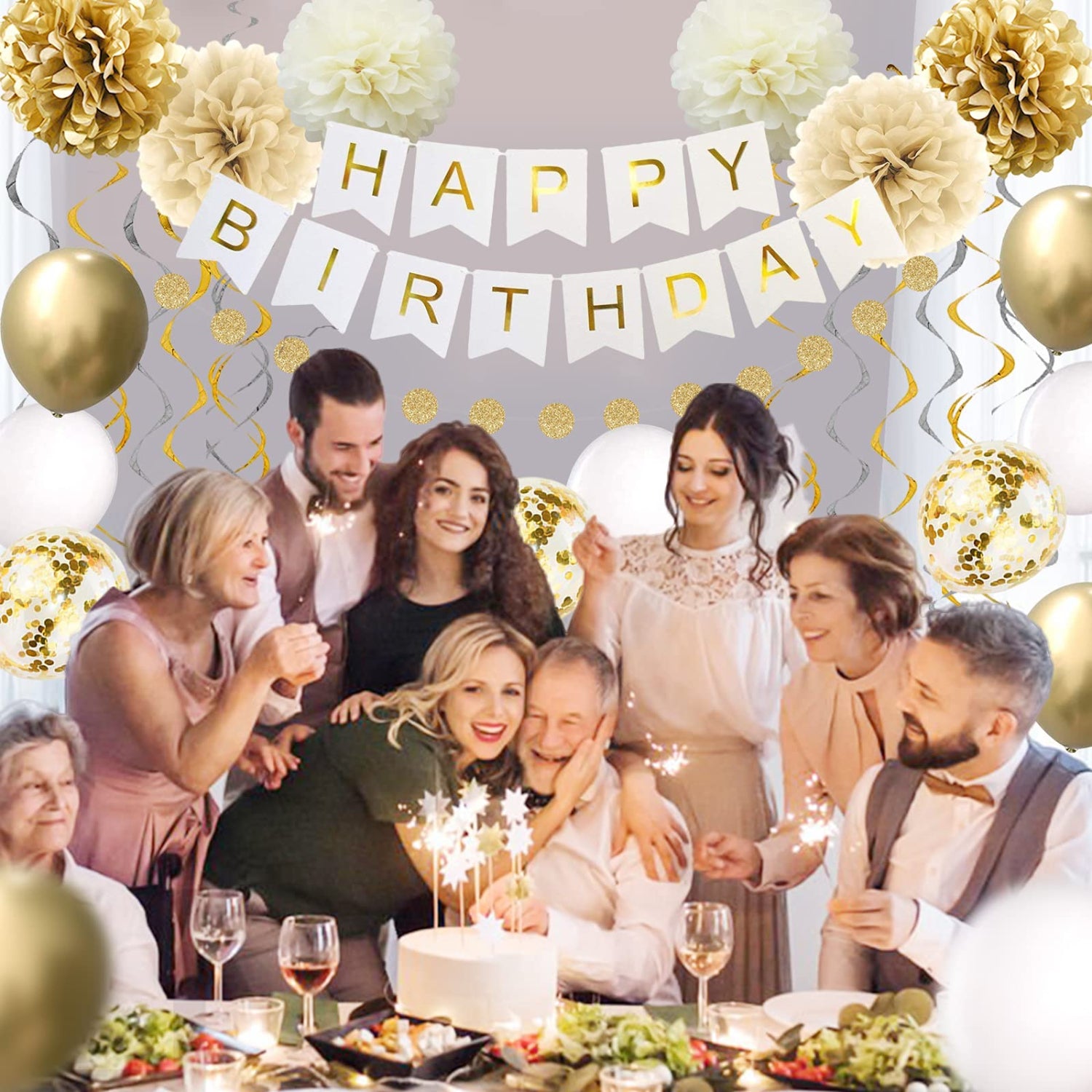 Gold Party Decorations, Happy Birthday Banner - 16th 18th 21th 30th 40th 50th 60th 70th Gold White Supplies Balloons