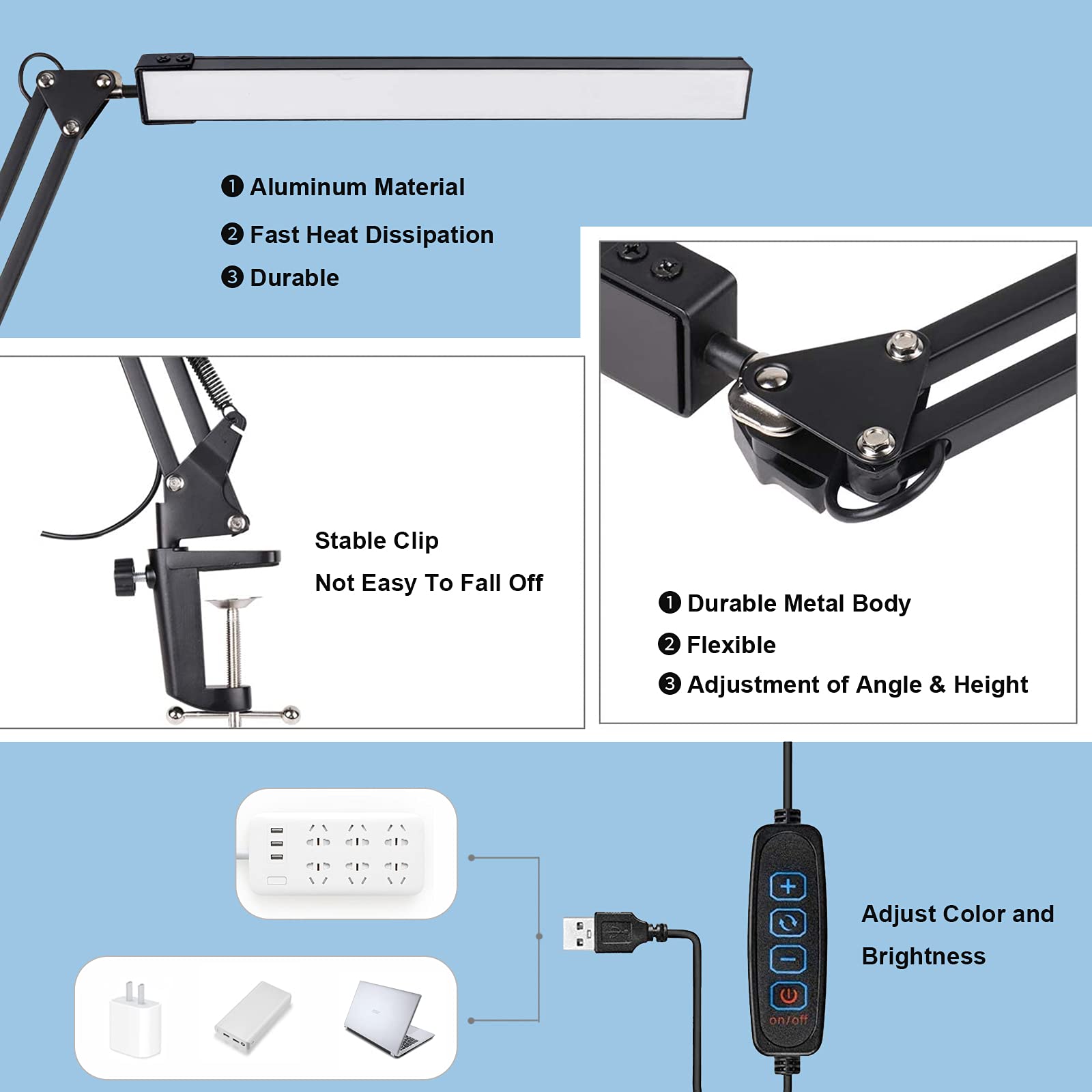 - 【ALUMINUM HEAT DISSIPATION ENERGY SAVING】- Compared with other ordinary desk lamps, this desk lamp adopts the newest grade aluminum alloy structure as the heat sink, which provides sufficient 14W's brightness, is more energy-efficient and has a longer service life, without frequent replacement, and reduces electricity cost and carbon footprint.
