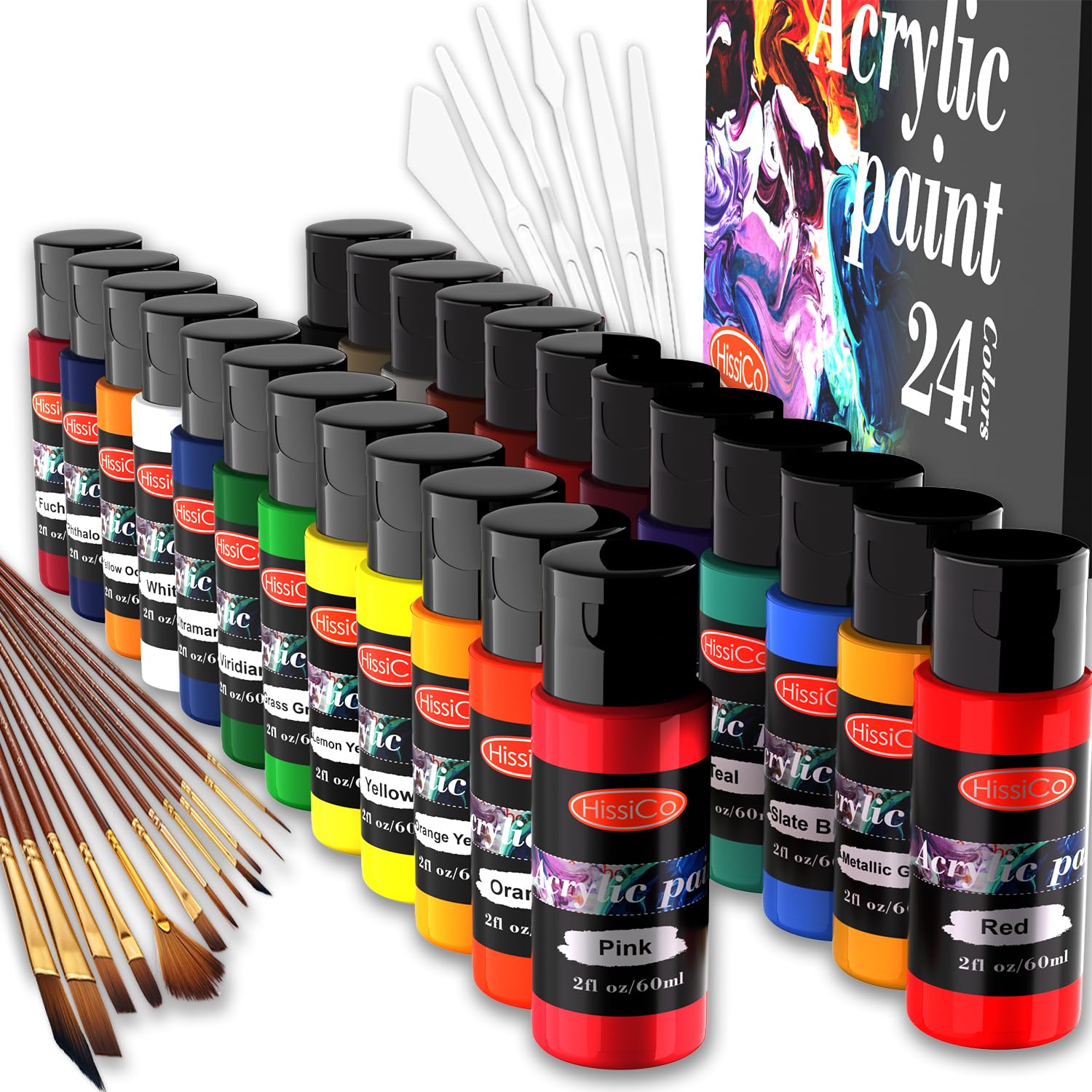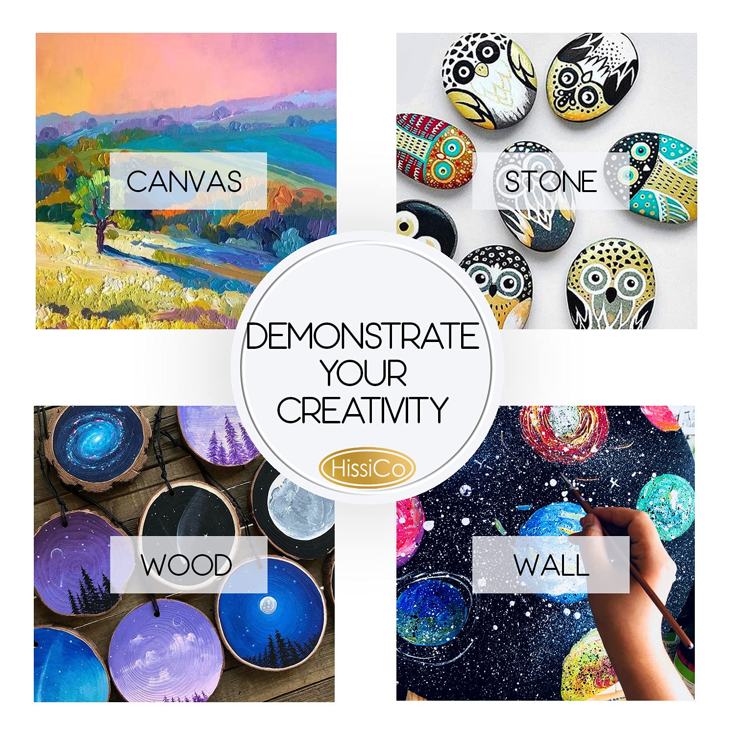 - 🖌Multifunctional Acrylic Paint Set- HissiCo acrylic paints are versatile in canvas art, painting, scrap booking and even nail arts, suitable for most surfaces, including stretched canvas, wood, glass, card decorating, plastic, craft foam, ceramic, decorative wallpaper, terracotta, blackboard easel, paper and tin