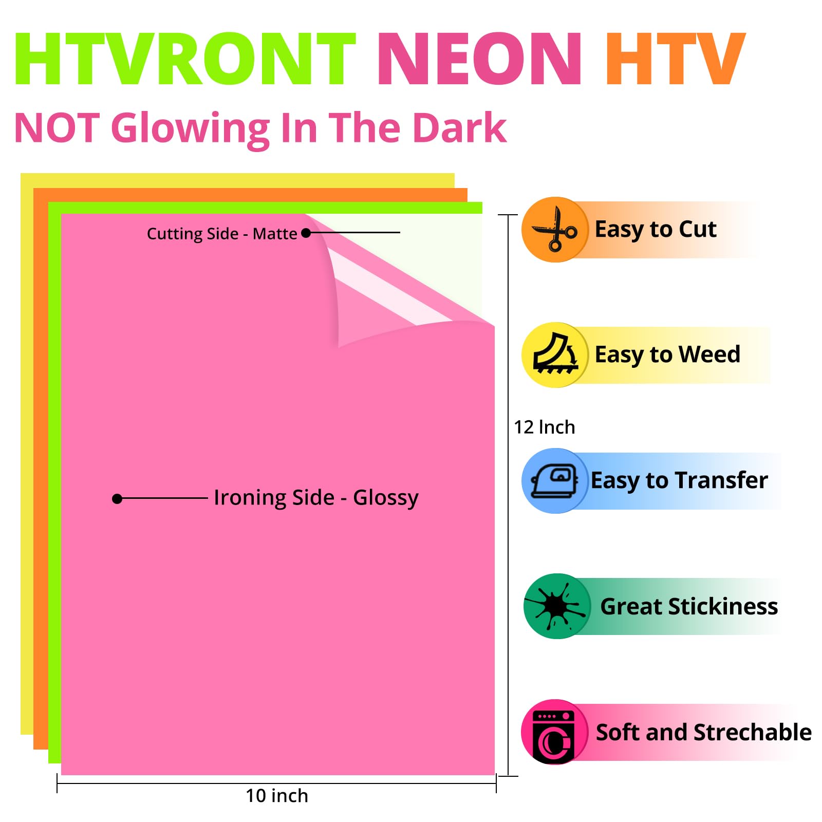 - 🌺New Neon HTV Combinations & Eye-catching Colors🌺 HTVRONT neon htv heat transfer vinyl is brighter and more eye-catching. Iron on vinyl contains 11 vivid colors including 4 neon colors (neon pink & neon green & neon yellow & neon orange) and 7 regular styles, meeting your diverse creative needs. ATTENTIONS: Our neon htv DOES NOT glow in the dark, but it keeps vibrant colors always. Have a more colorful life with HTVRONT now!