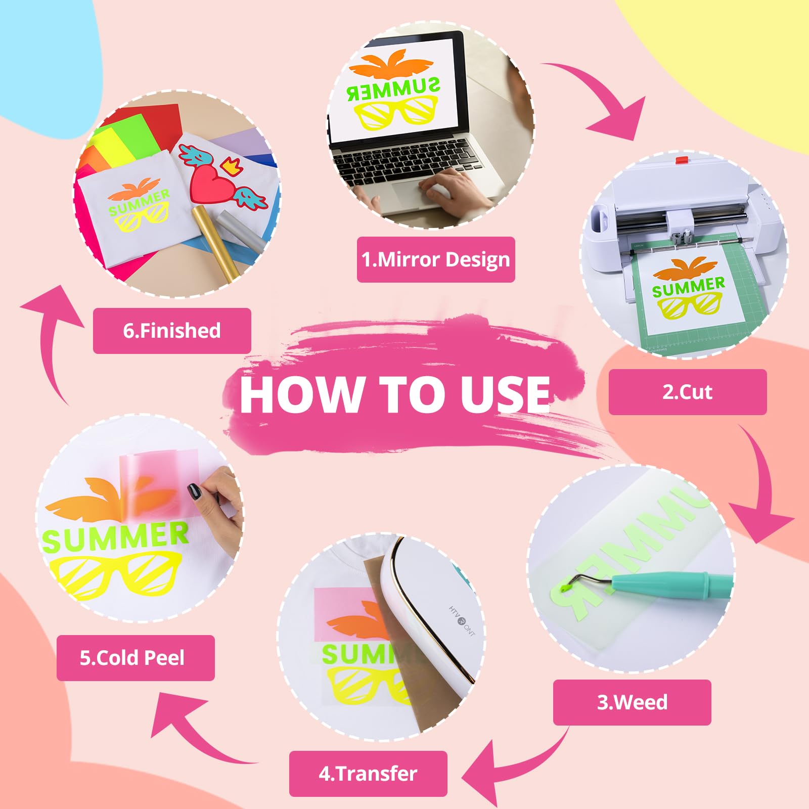 - 🎀Easy to Cut & Weed & Transfer🎀 The neon heat transfer vinyl bundle is thin and smooth, making it easy to cut and weed. HTVRONT htv vinyl is suitable for Cricut, Silhouette Cameo, etc. Our htv vinyl is particularly sensitive to temperature and pressure, so that you can easily transfer and cold peel. We have provided a reference parameters to easy your cut, weed and transfer in our product manual. Let's start crafting with neon htv heat transfer vinyl now!