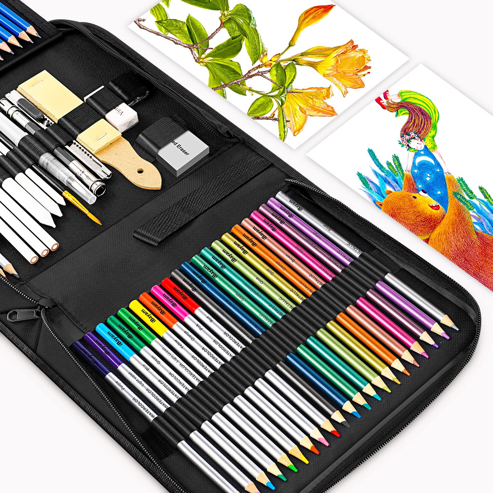 - 【Complete Art Supplies 78-pack in one Potable Case】 This Premium drawing set includes 12 graphite pencils(2H、3H、4H、5H 、HB、B、2B、3B、4B、5B、6B、8B), 12 colored pencils,12 watercolor Pencils, 12 charcoal Pencils,3 white charcoal pencils, 12 metallic pencils, 1 sandpaper block, 1 pencil extender,1 paint brush, 1 sharpener, 1 art knife, 1 eraser pencil, 3 blending paper stumps, 1 refillable water brush pen, 1 vinyl eraser and 1 Travel Case. Each pencil is marked with color name and model.