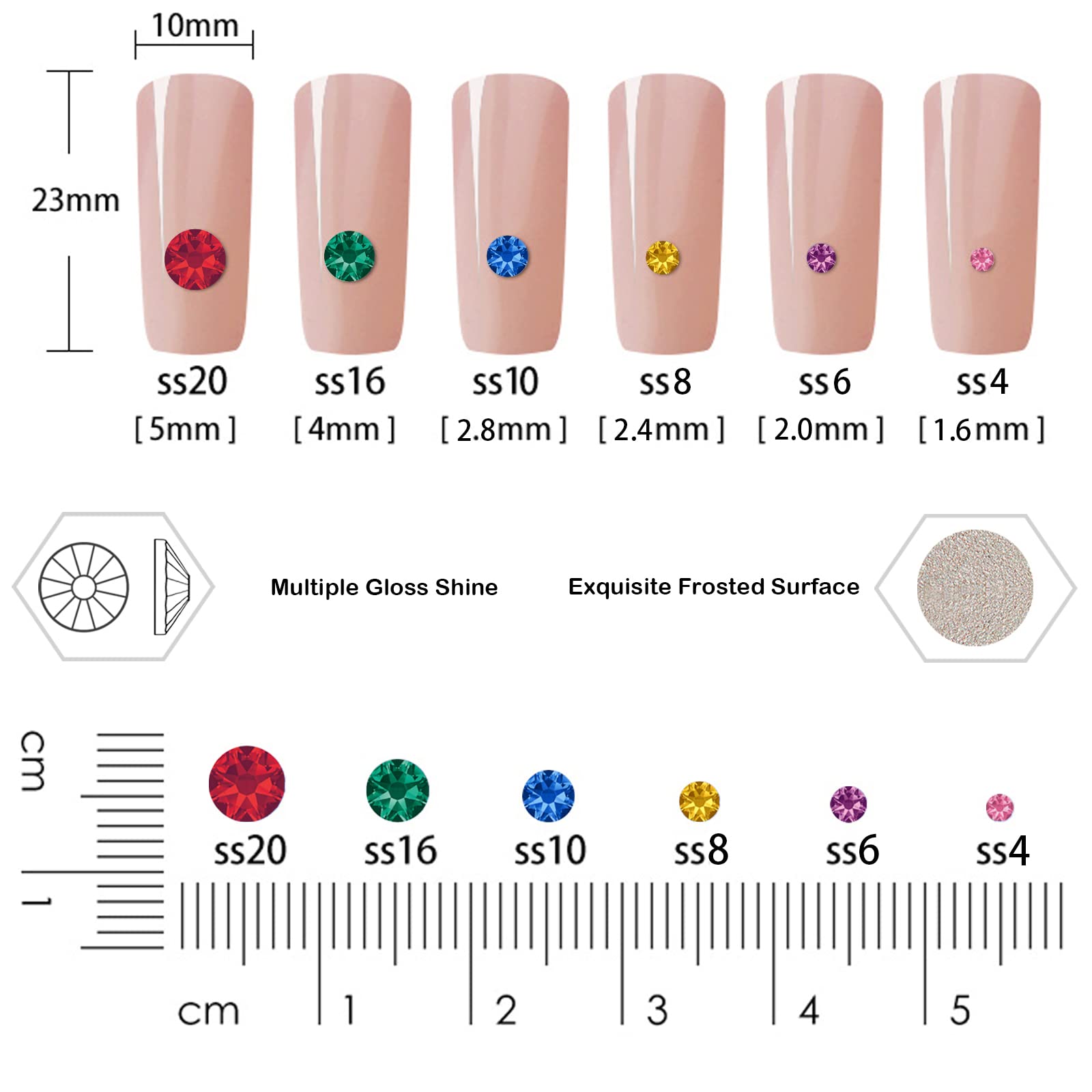 - 5 Sizes of crystal rhinestones with storage boxes easy to carry and store, Flat backs (Non-Hotfix) Style. SS6 (1.9-2.0mm) / SS8(2.3-2.4mm)/ ;SS10 (2.7-2.8mm) / SS16 (3.9-4.0mm) / SS20 (4.8-4.9mm).