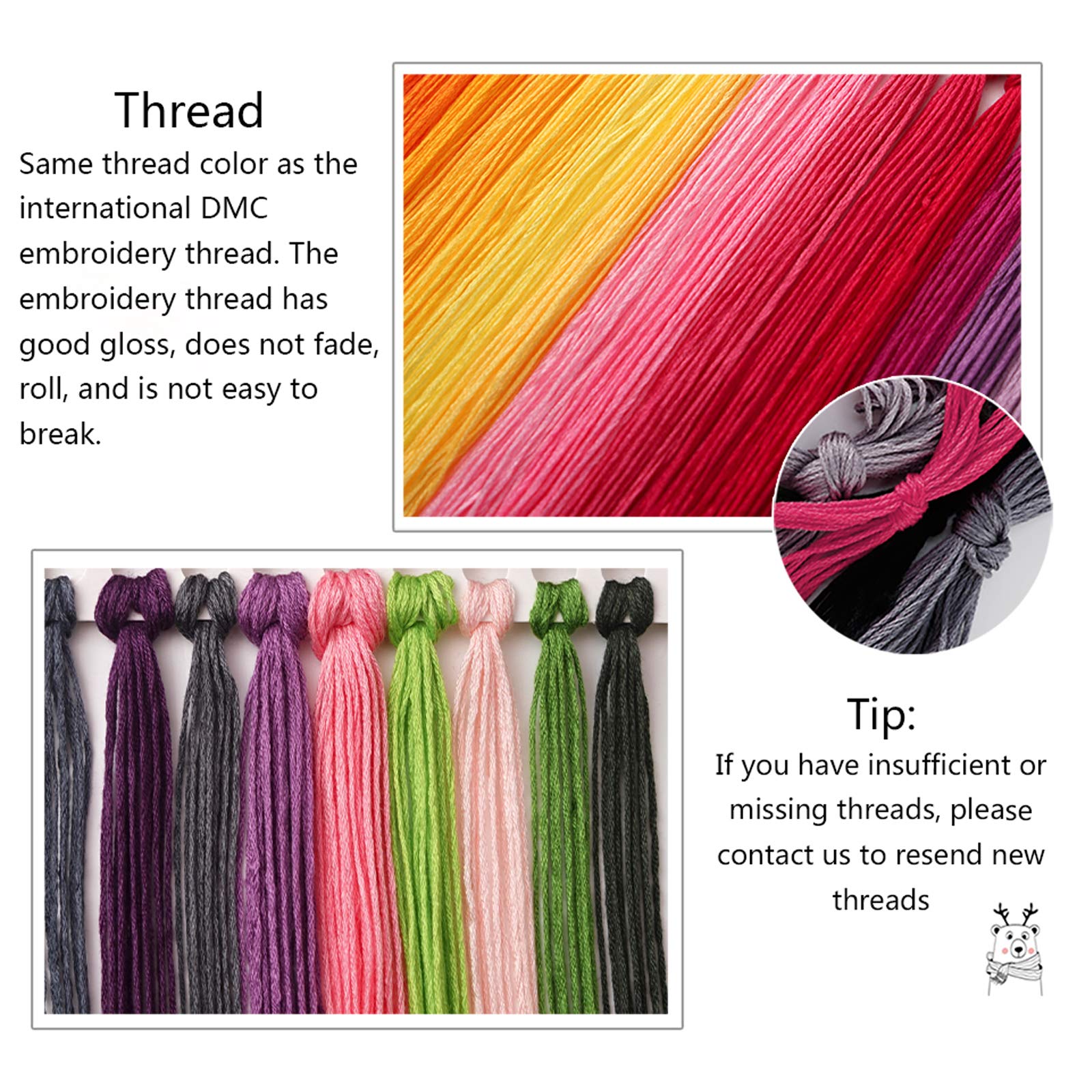 - Note:For 11CT cross stitch, please use 3 strands of thread and 2 strands for reverse stitching. Since the cross stitch uses water-soluble printing and dyeing agent, please do not get wet before finishing.