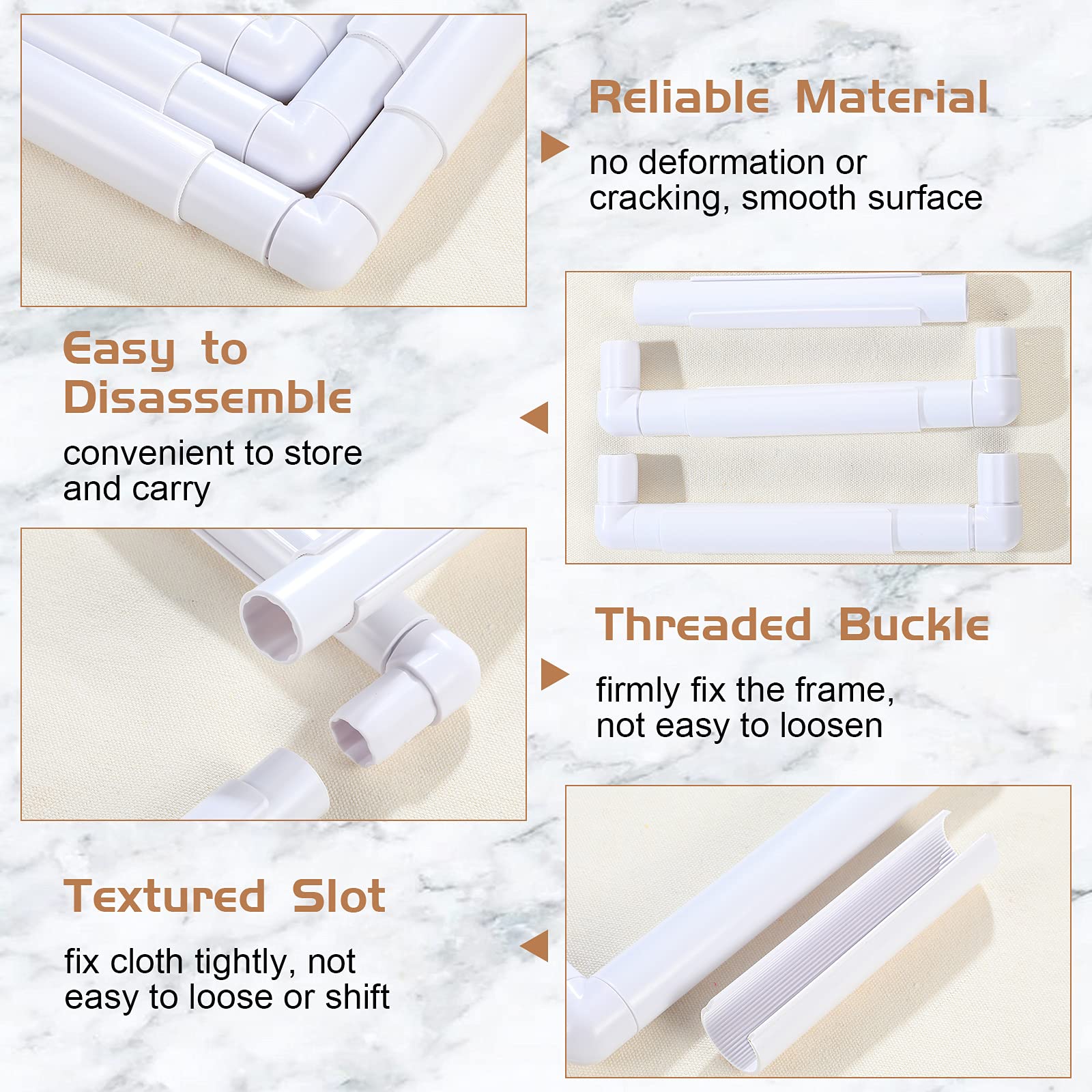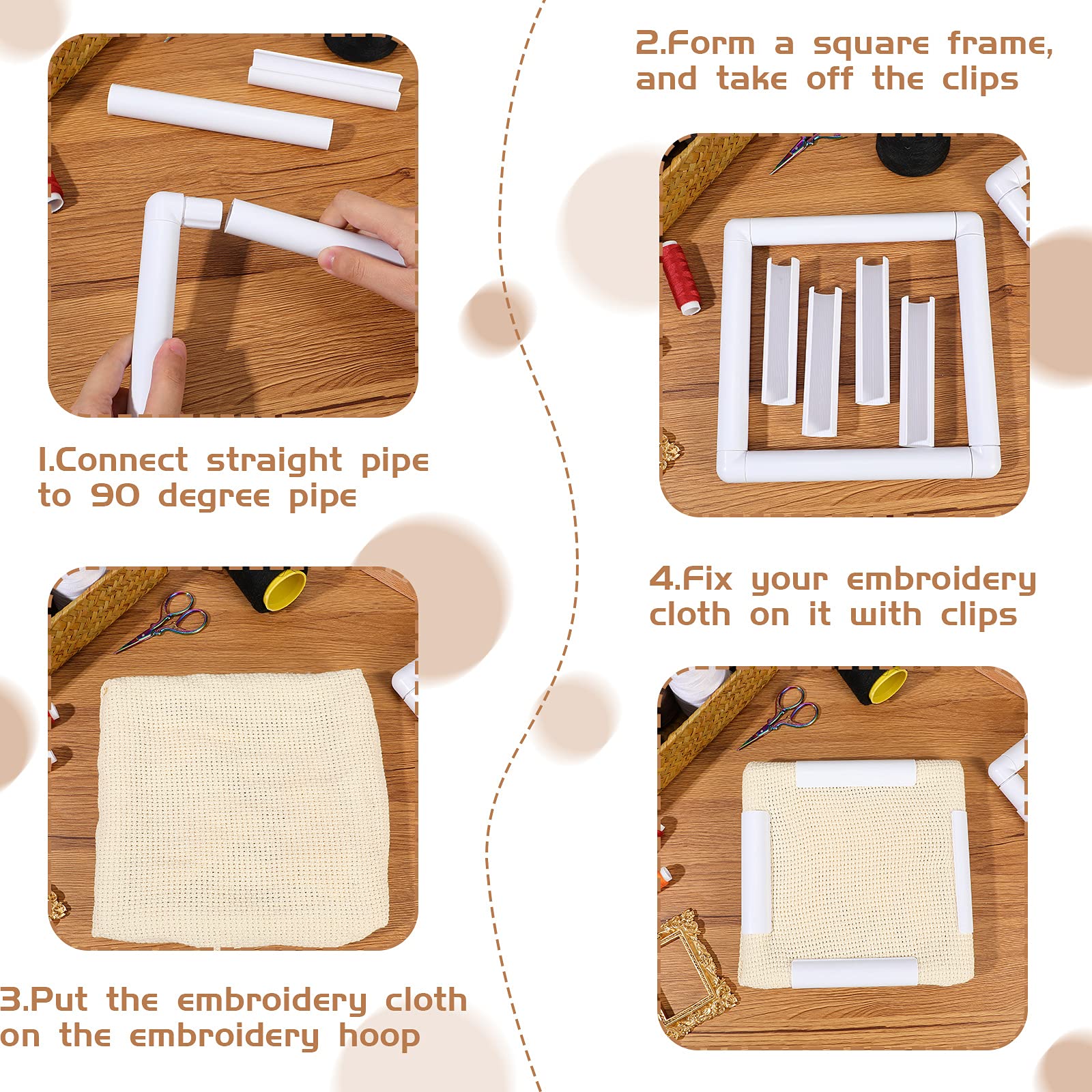 - Convenient to operate: to assemble the white embroidery hoop, you just need to connect these straight tubes to these 90 degrees tubes, forming a rectangle frame, then fix your embroidery cloth on it with clips, not occupying too much time and energy, besides, you can easily disassemble the frame by hand, no tools needed