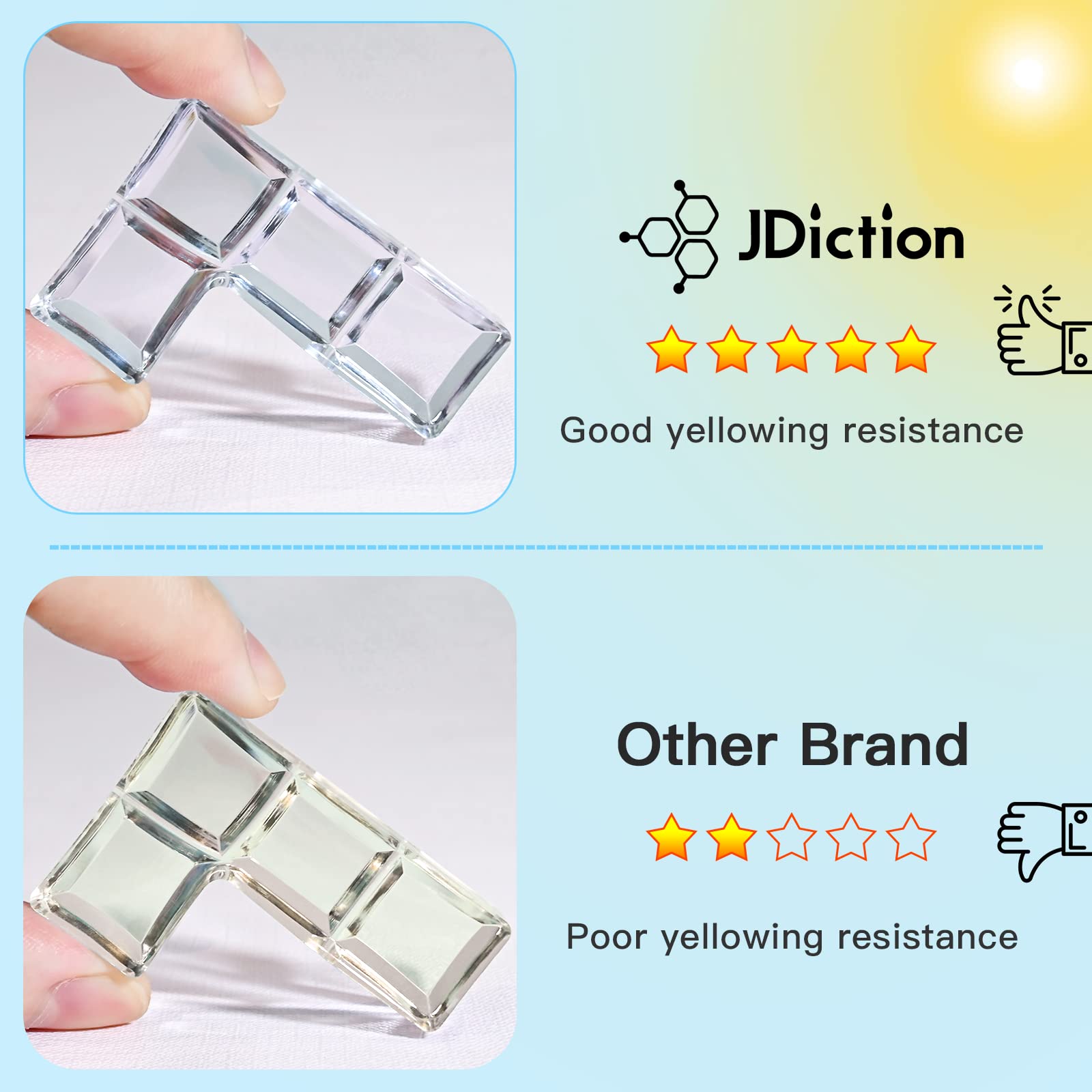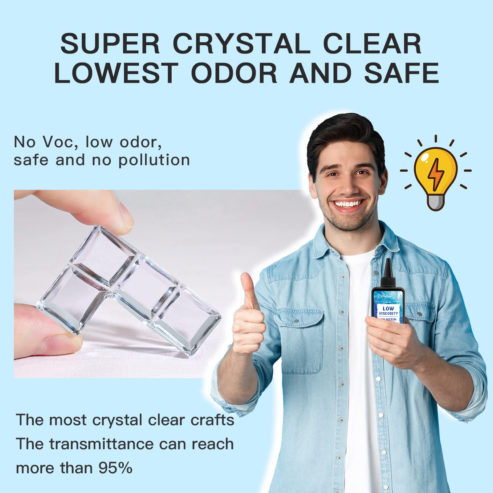 - 💧【SUPER CRYSTAL CLEAR & LOWEST ODOR AND SAFE】JDiction UV Resin cooperates with the largest supplier in Southeast Asia. We only produce the purest resin, you can get the most crystal clear and gloss crafts. At the same time, we adopt the safest way to develop and produce to create a healthier and lowest odor resin, no pollution to the environment, allowing you to complete the craft work more comfortably.