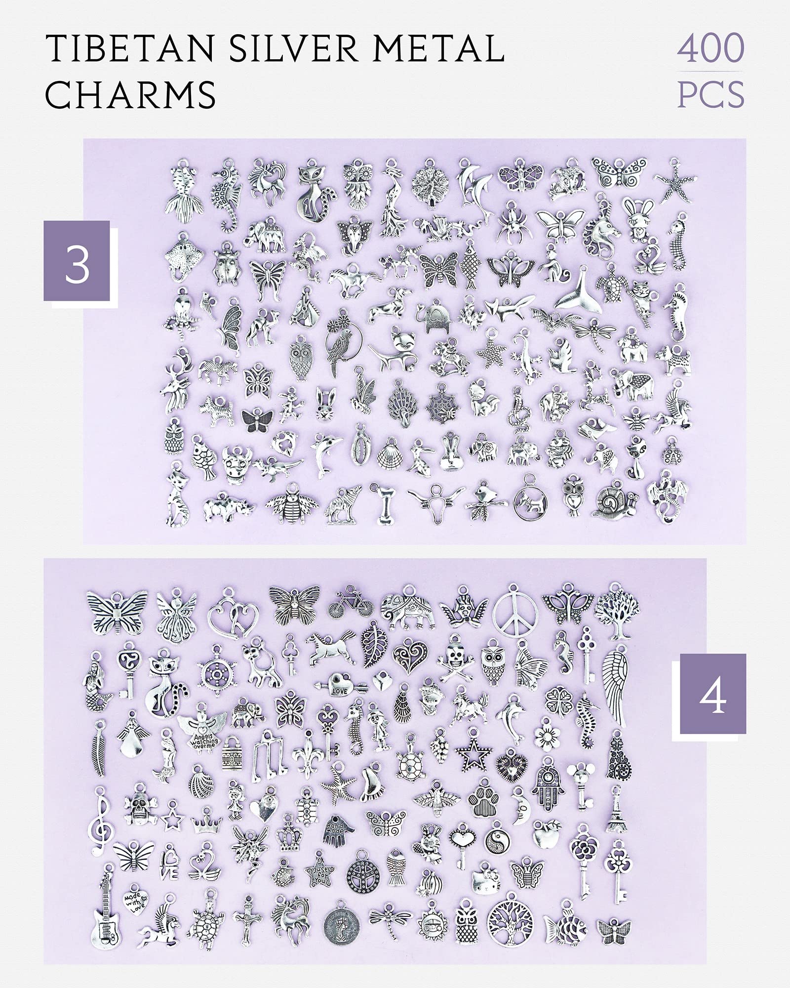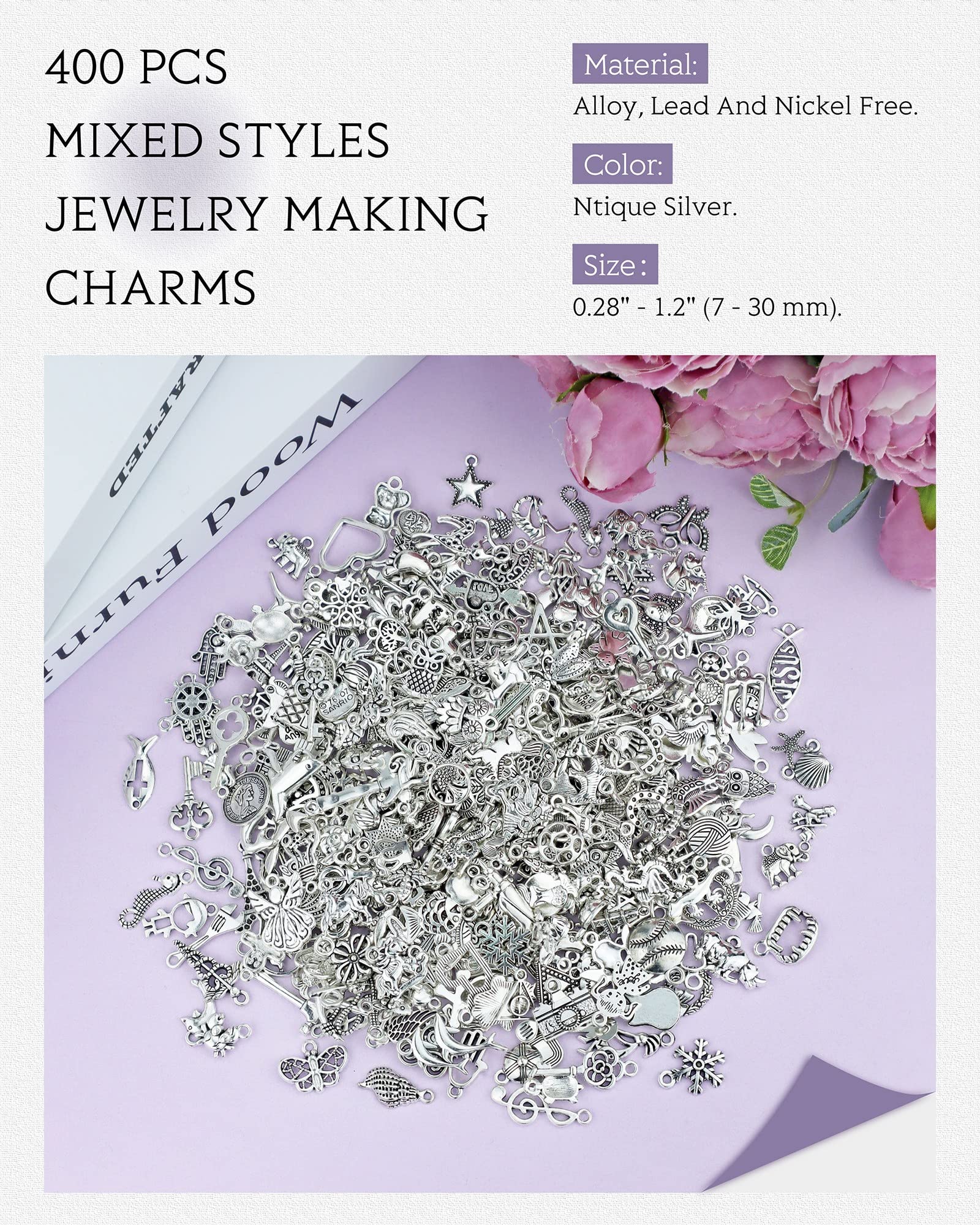 - Quantity: 400 pcs jewelry making charms. Mixed flowers, animals, music, nautical, star, moon, tree, fruit, key, wing, sport alloy charms and so on, appropriate for your different needs for DIY crafts.