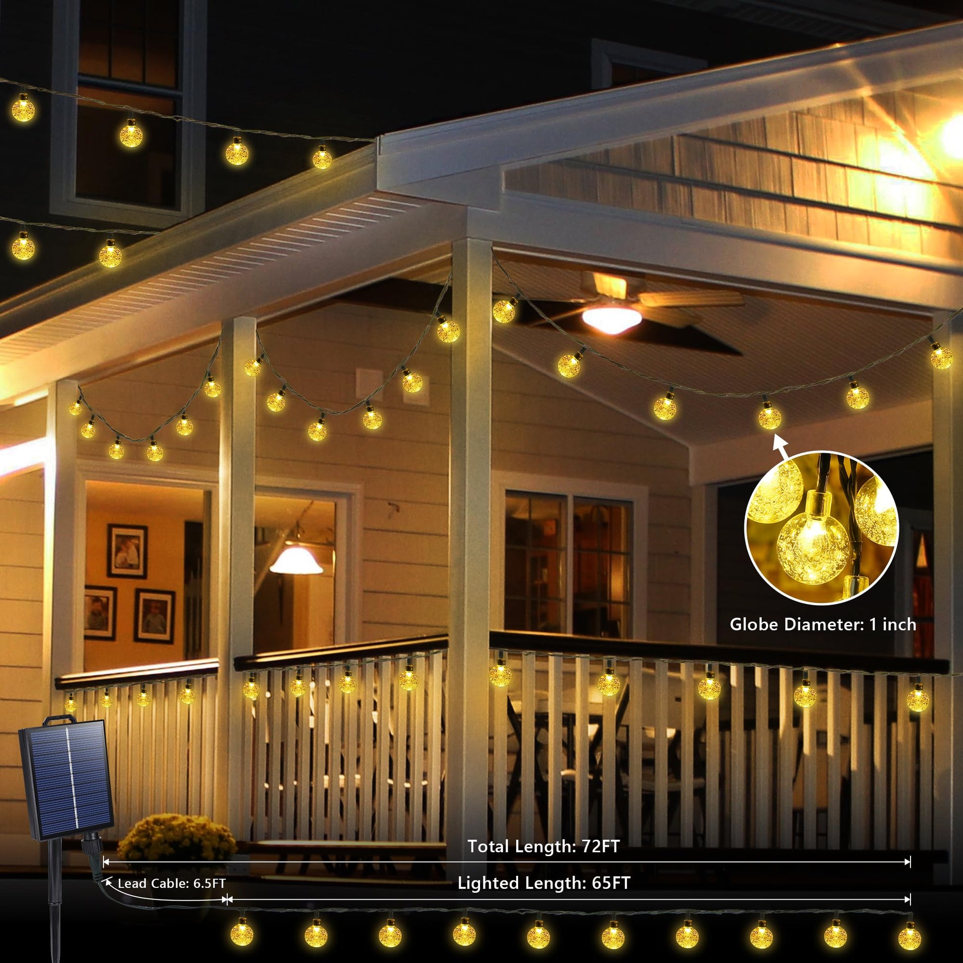 - Specifications: The Joomer solar string lights come with 100 LED crystal globes, with a globe size of 1-inch and a length between 2 bulbs of 0.65ft. The lights are 72ft long (including a 6.5ft lead cable)