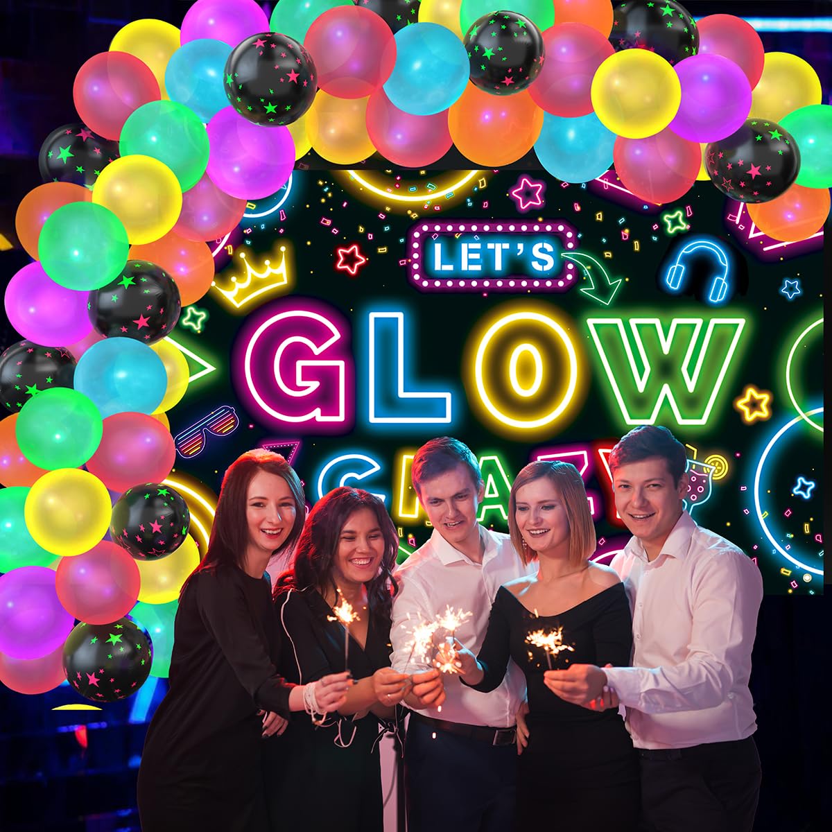 Neon Glow Party Decorations Glow in the Dark Party Supplies 60Pcs UV Blacklight Luminous Neon Balloons Arch Kit and Let's Glow Crazy Decorations Backdrop for Birthday Sleppover Decor