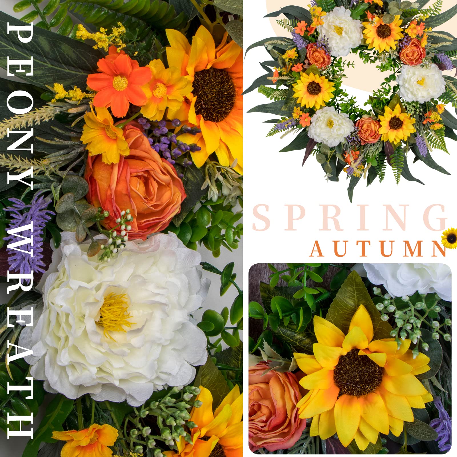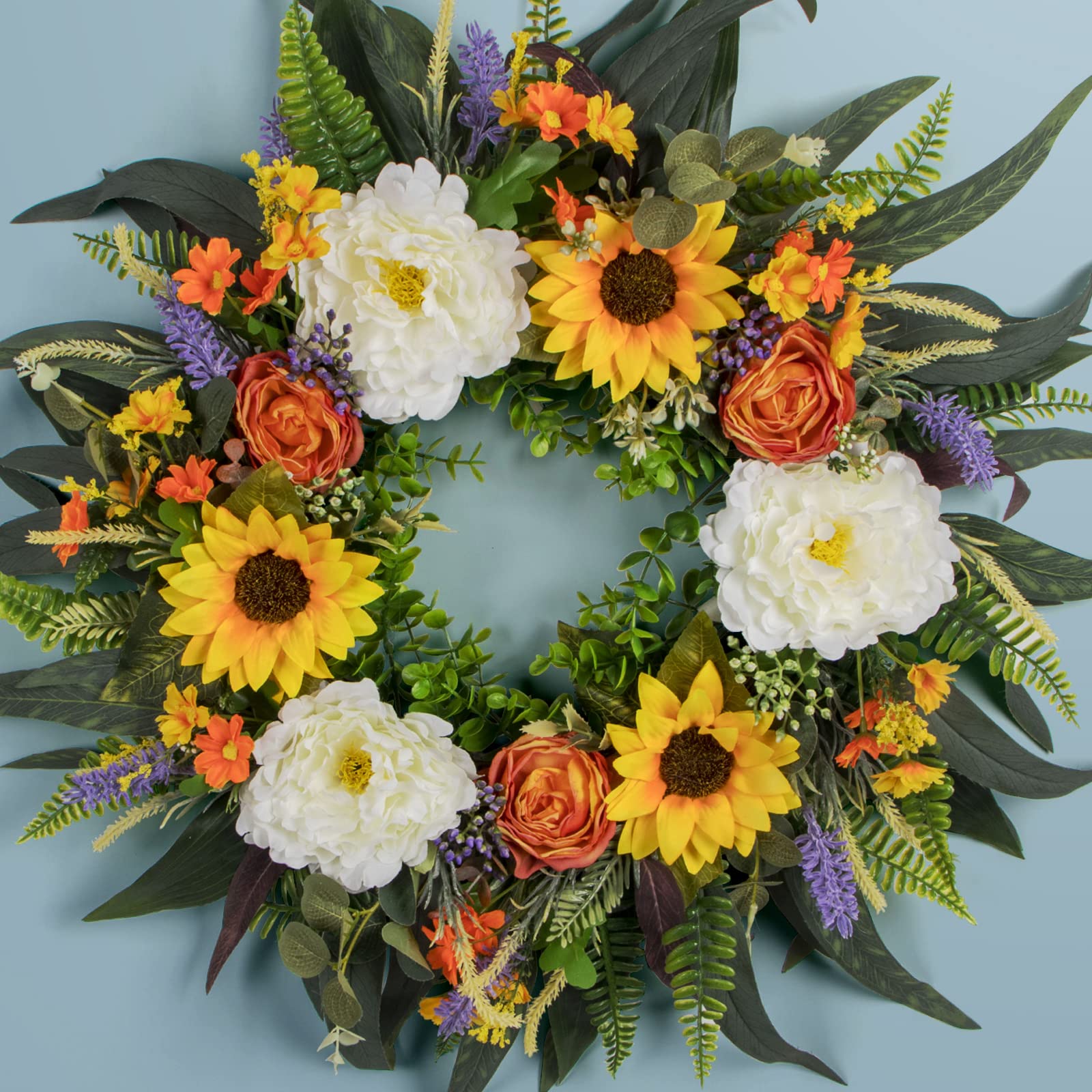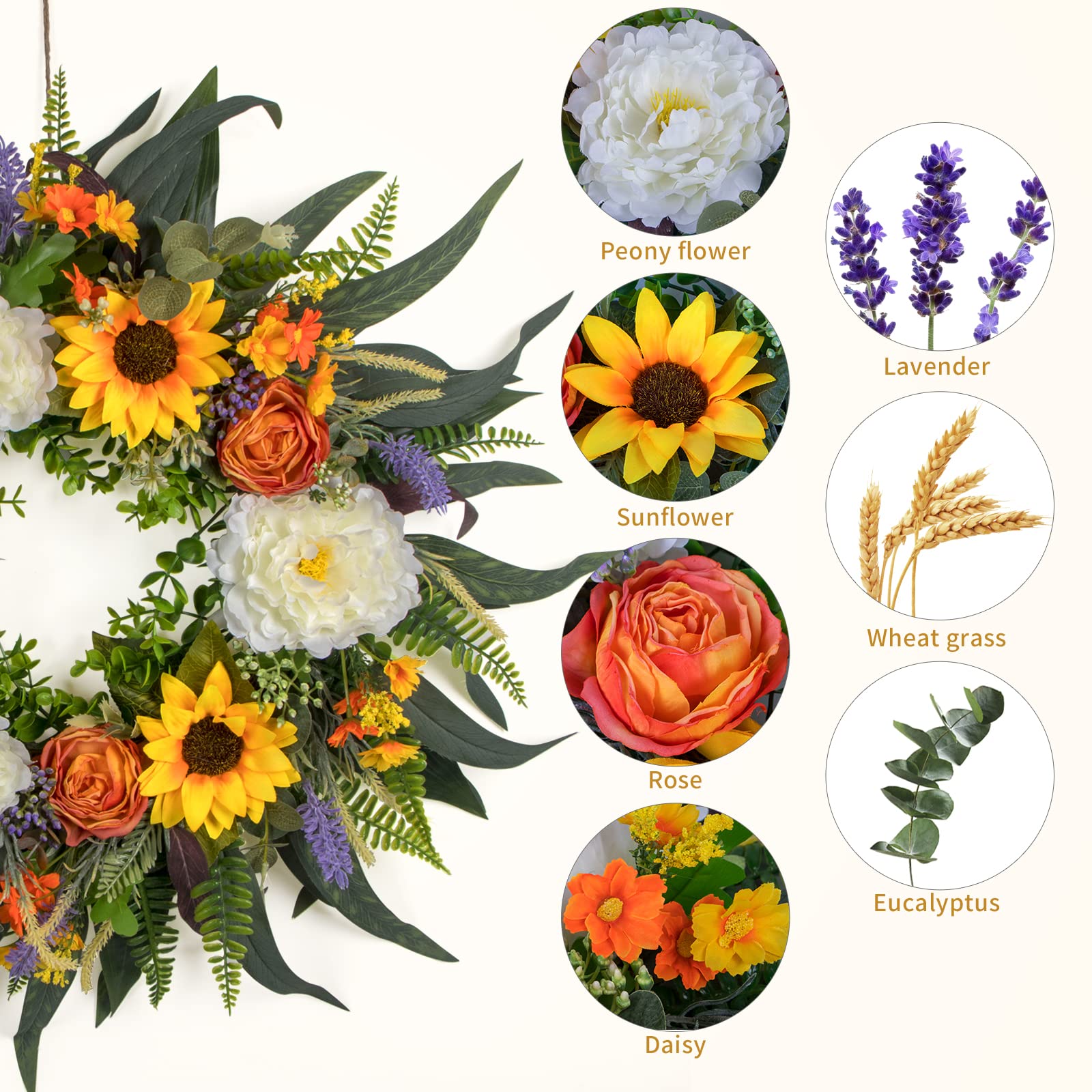 - Professional florists use more than a dozen kinds of artificial flowers such as daisies, peony, roses, lavender, eucalyptus leaves, sunflowers to customize this wreaths, with unique color matching, suitable for the four seasons of spring, summer, fall and winter