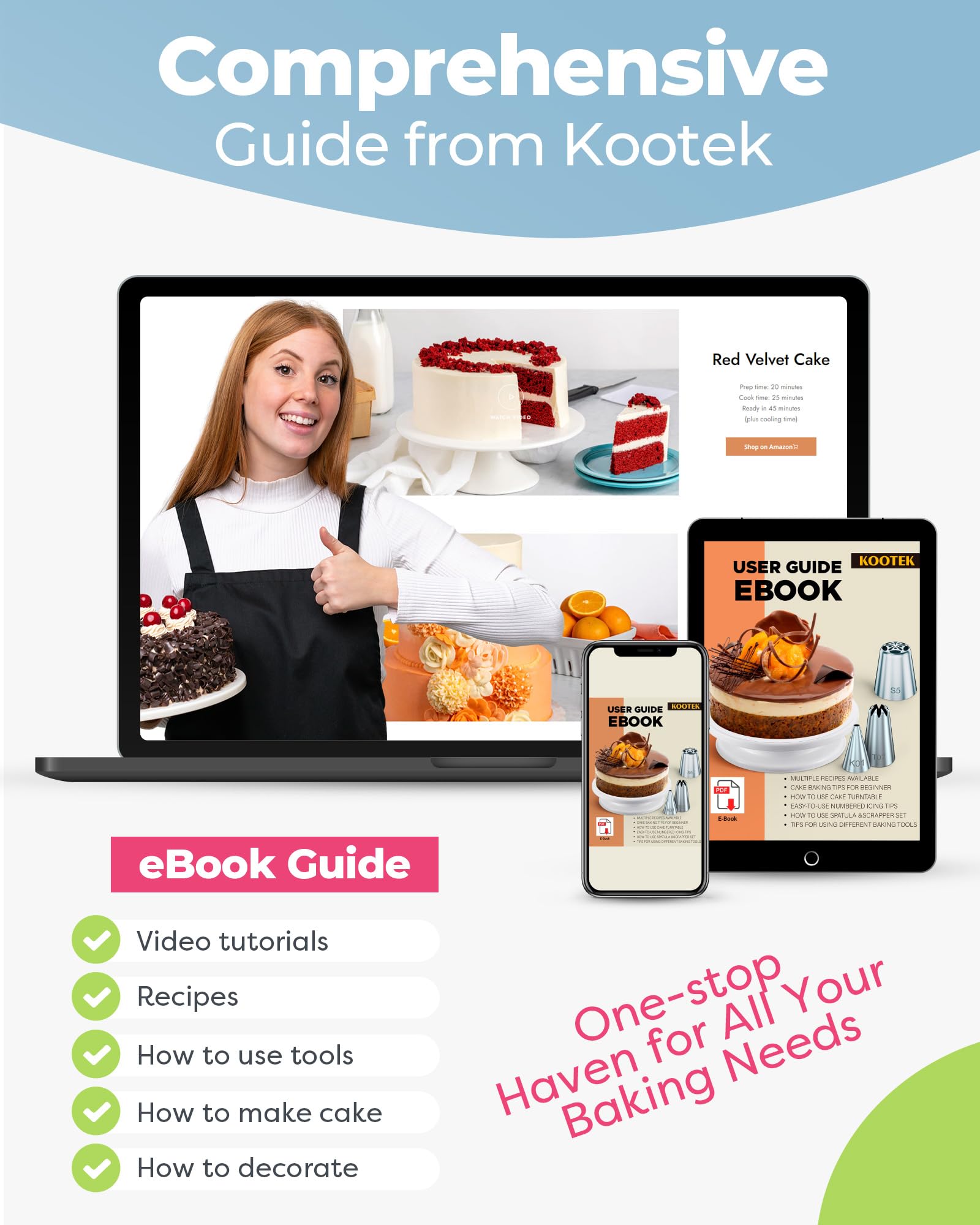 • Essential Cake Decorating Kit: 55 numbered stainless steel piping tips, 2 reusable piping bags, 20 disposable bags, 3 shapes of cake scraper, 3 reusable converters, 4 pastry bag ties, 1 flower lifter, 1 flower nail, and 1 tips brush. With these key baking tools, you'll be able to make cake decorating a piece of cake. Moreover, the User Guide is an eBook that has been carefully tailored to help you maximize your usage of this piping bags and tips set.
