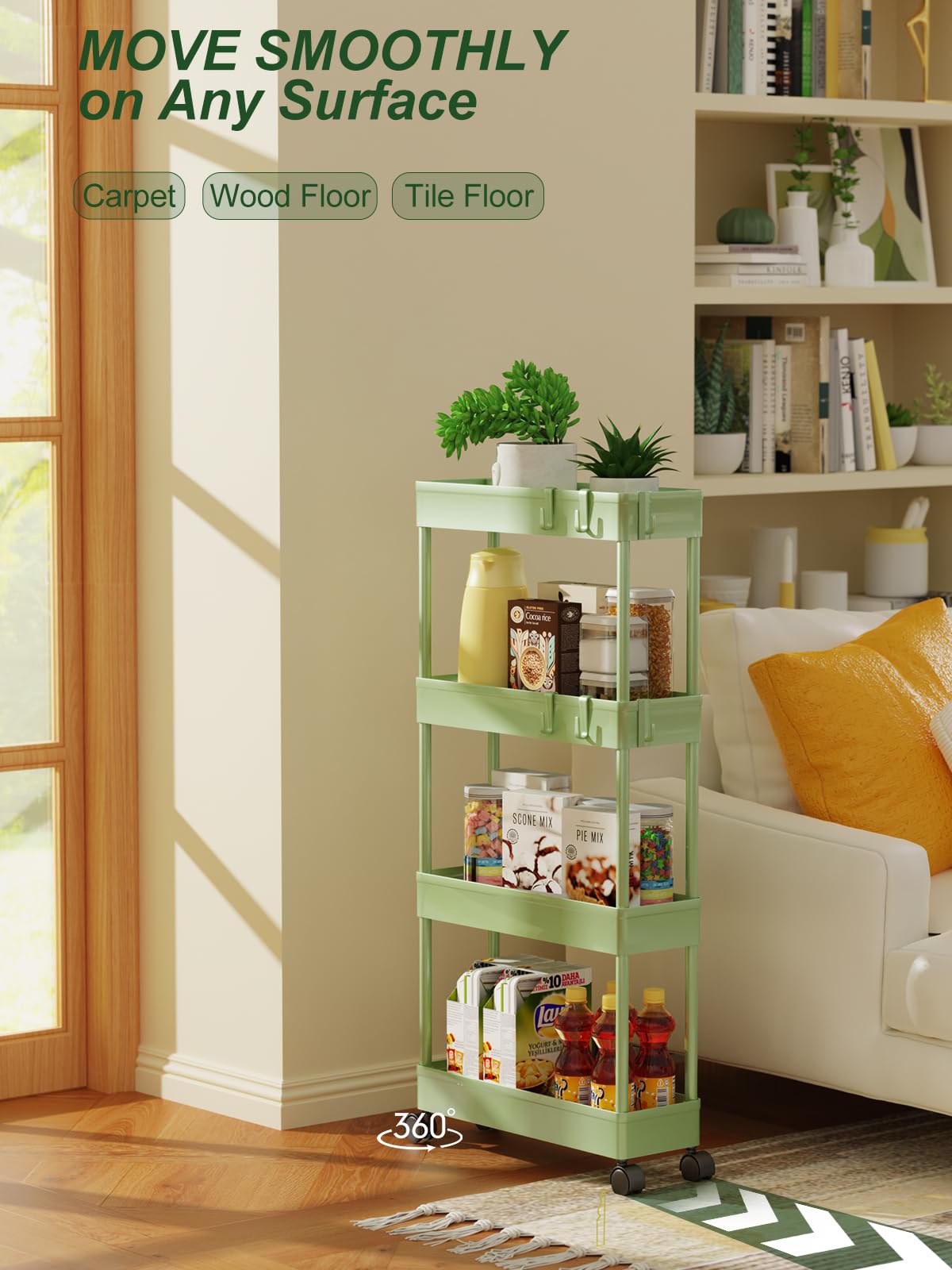 5.1" Slim Storage Cart - 4 Tiers Bathroom Organizer Mobile Shelving Unit Storage Rolling Utility Cart Slide Out Organizer for Kitchen Bathroom Laundry Narrow Places, Green