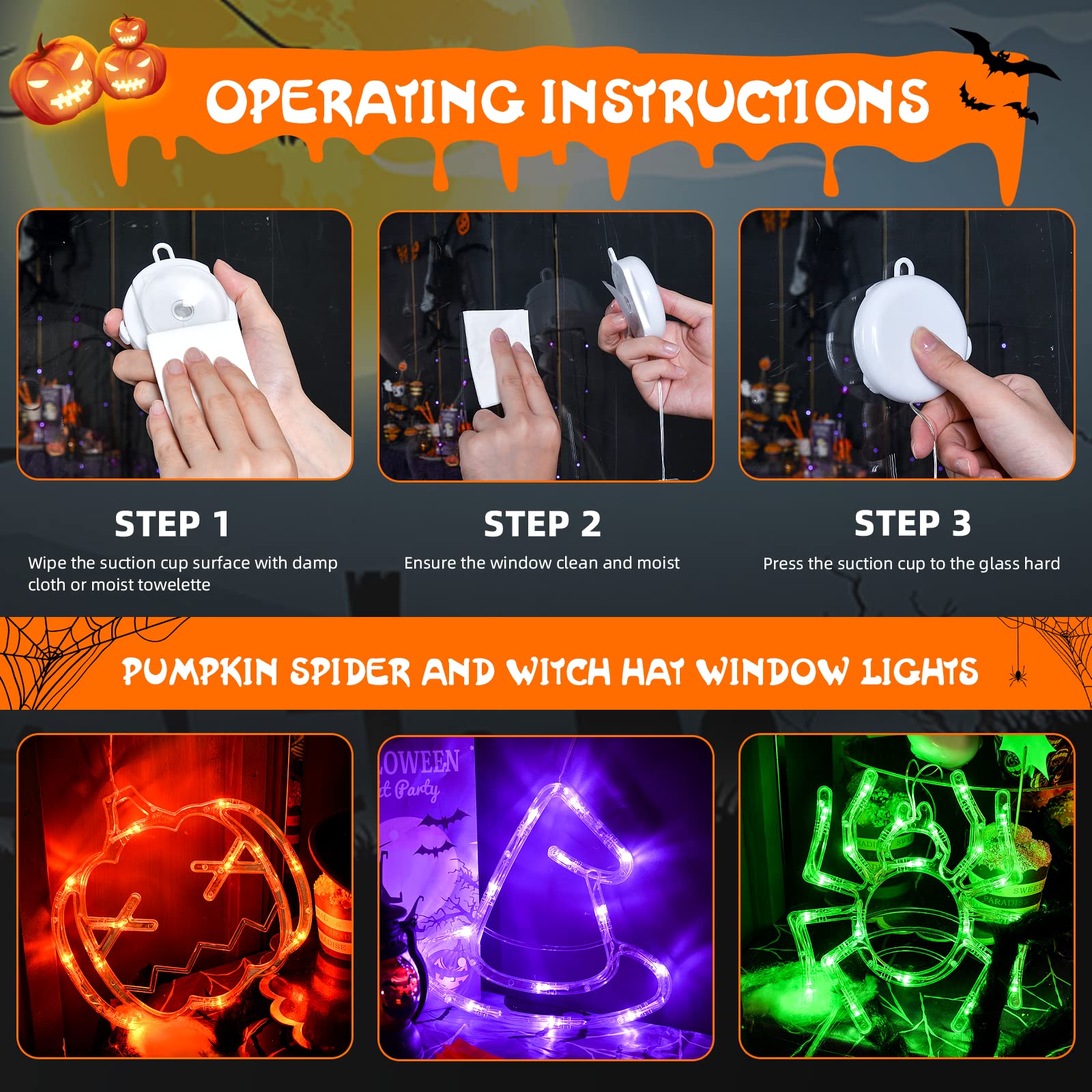 Halloween Decorations 3 Pack - Orange Pumpkin, Green Spider, Purple Witch Hat Window Lights With Suction Cup - Battery Operated, Upgrade Slow Fade Mode, Timer Function