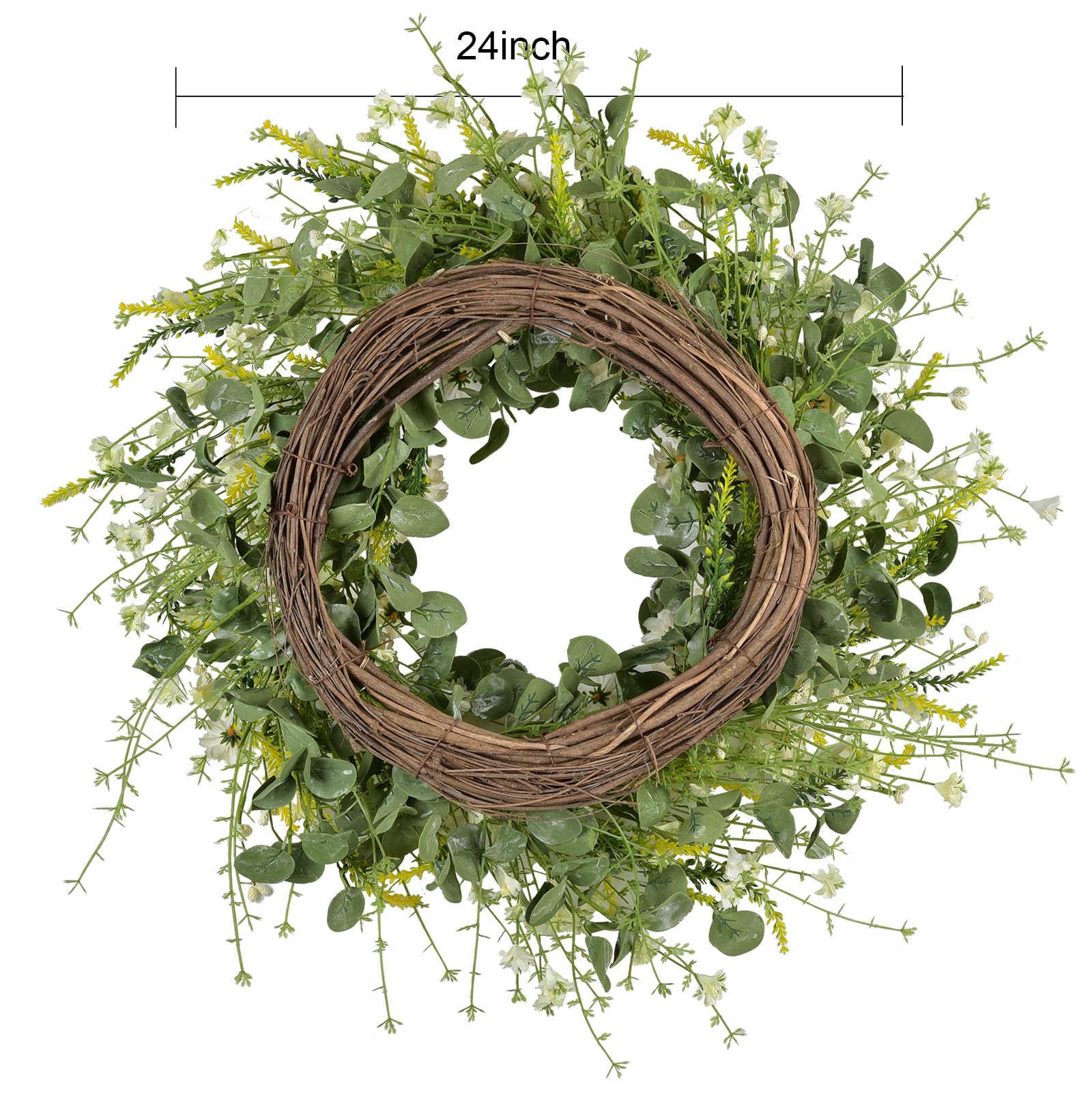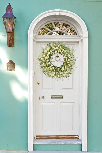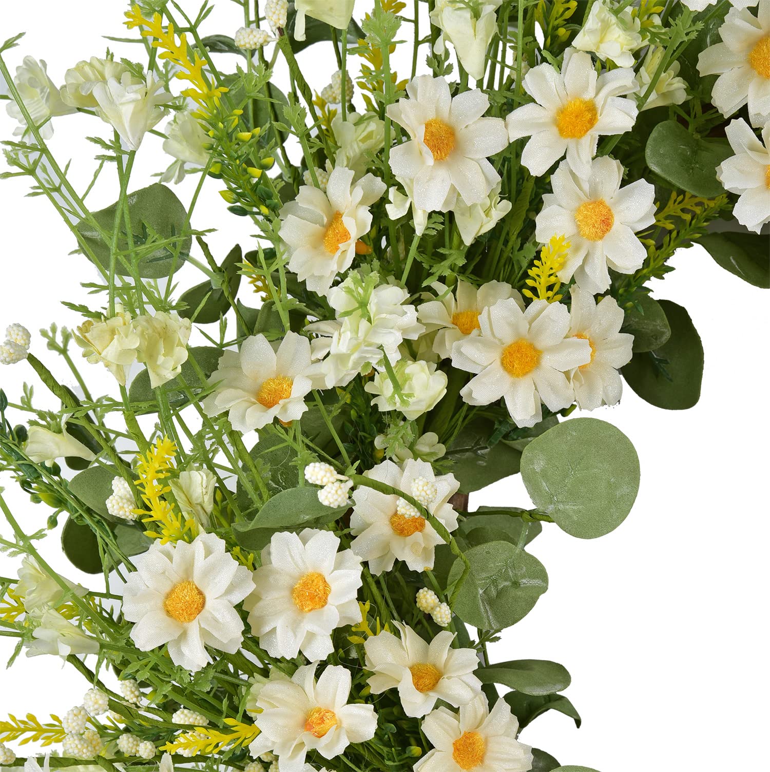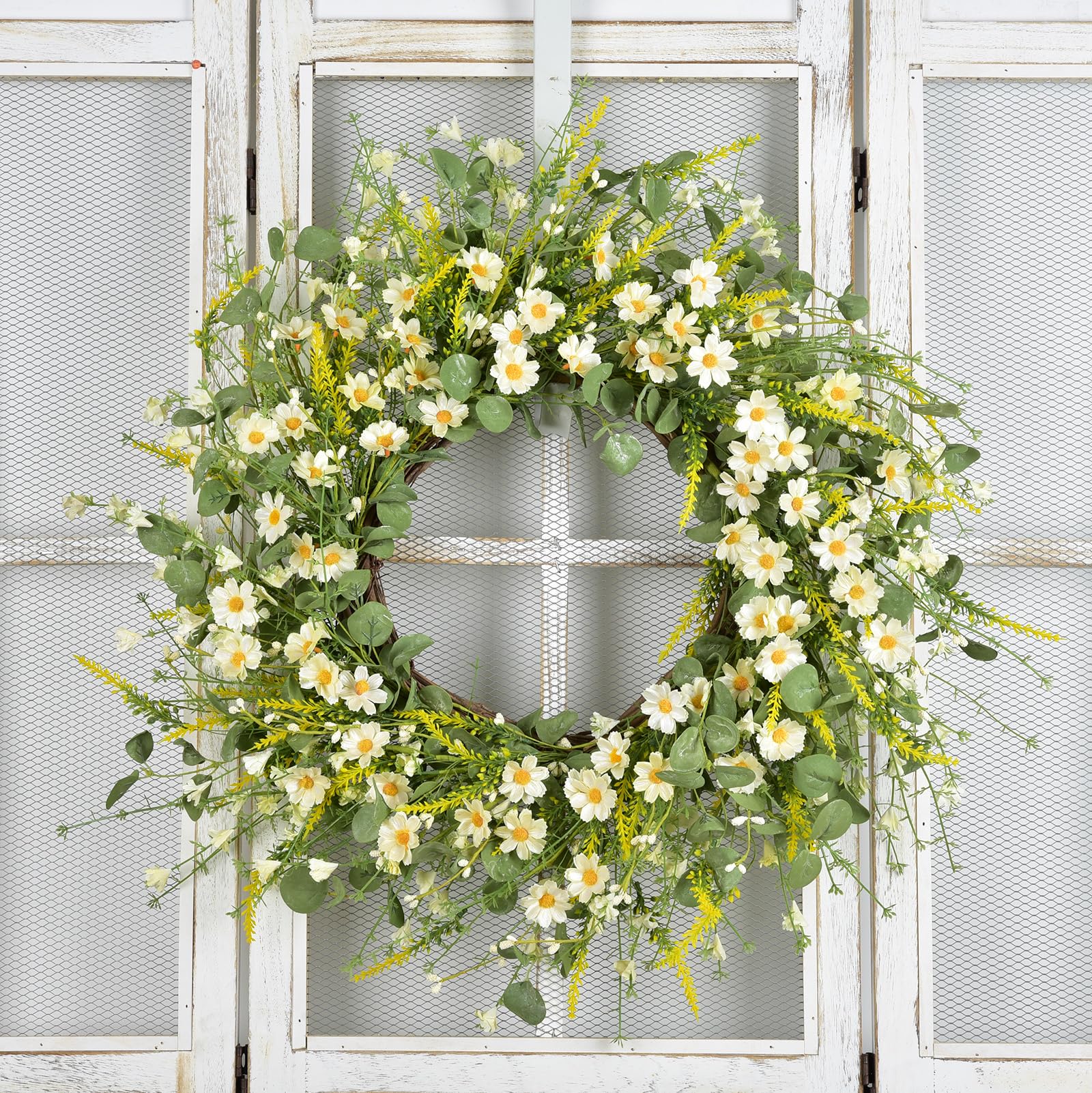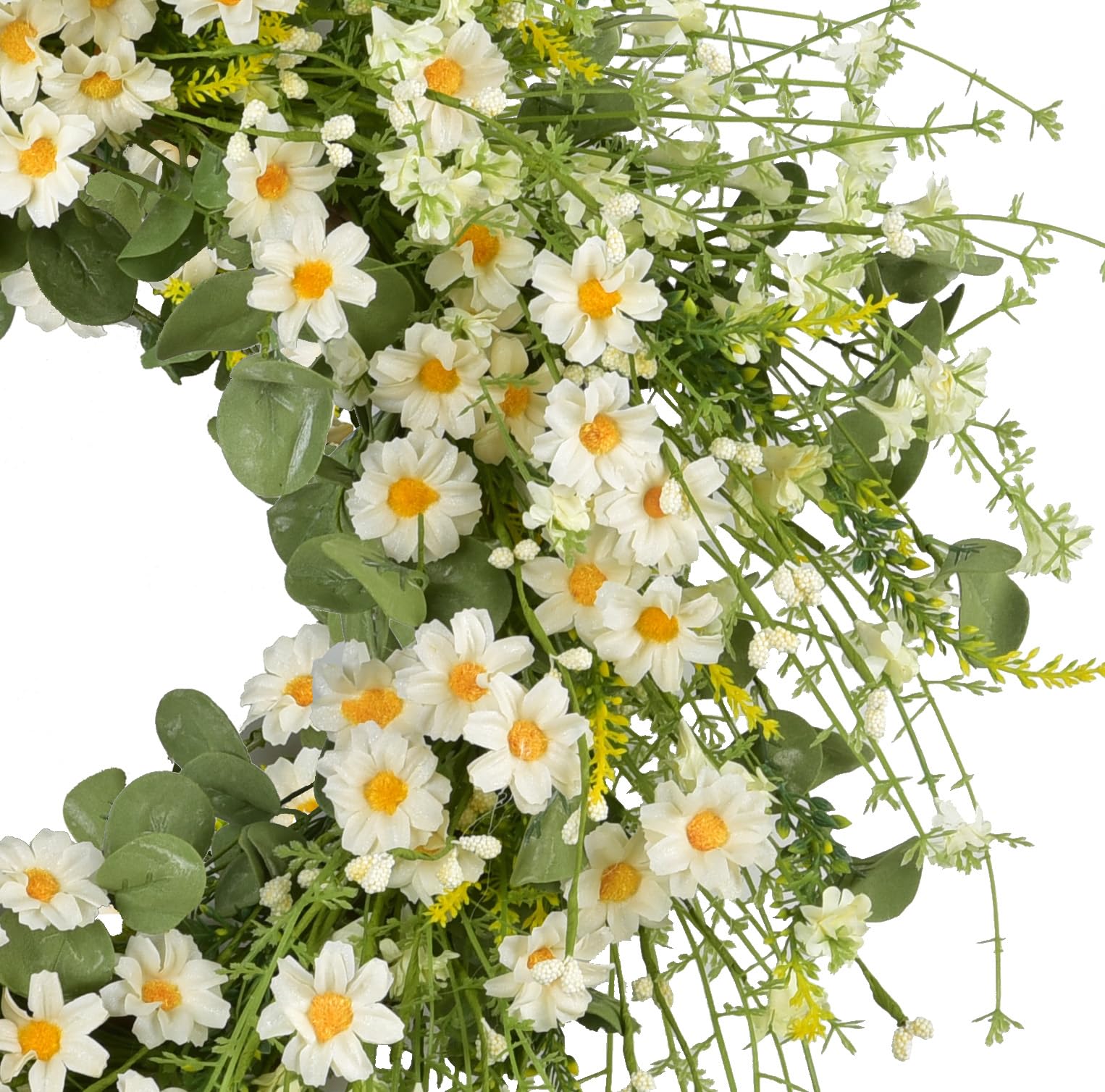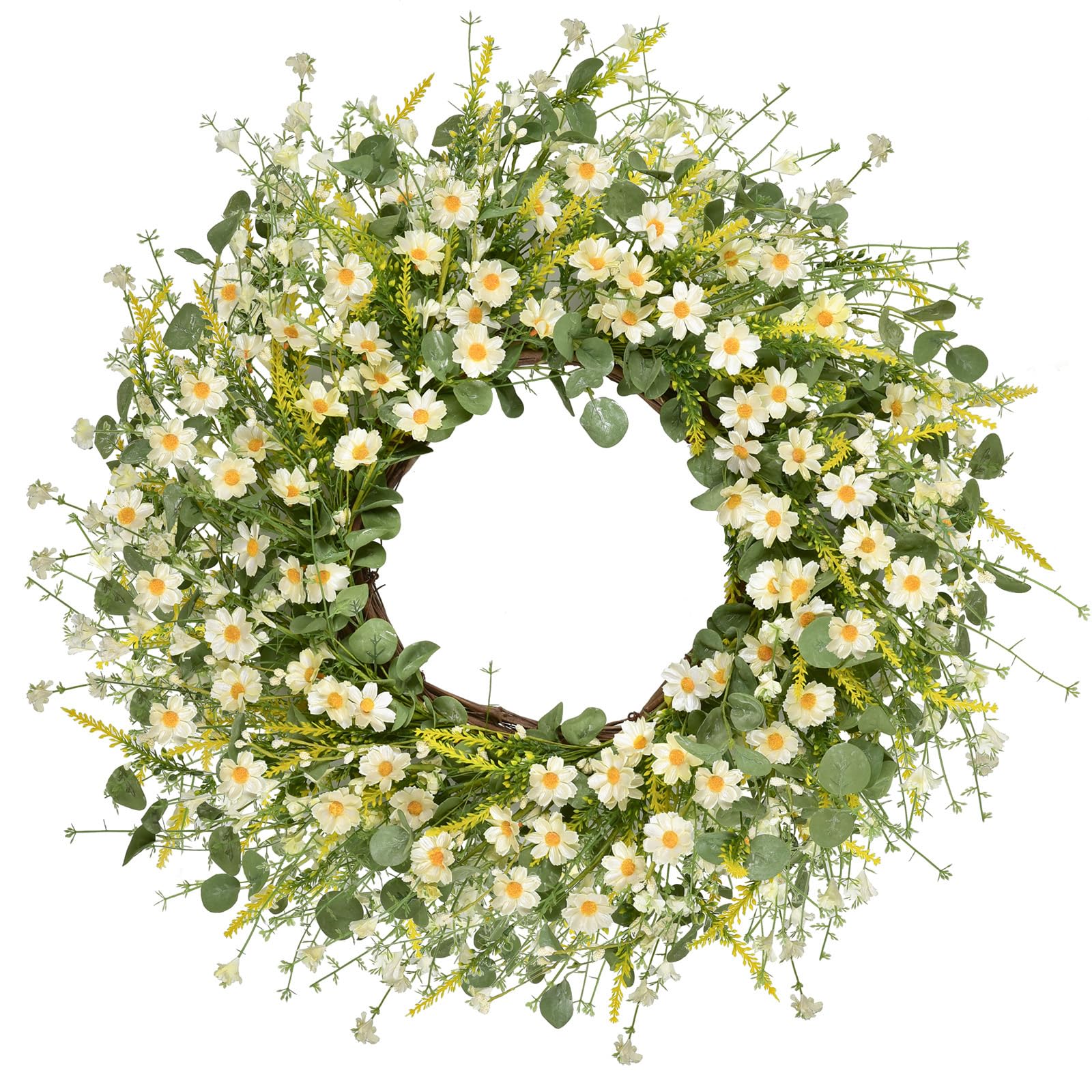 24 Inches Artificial Daisy Flower Wreath with Eucalyptus Leave Silk Flower White Berries Spring Summer Wreath for Front Door Wall Decor