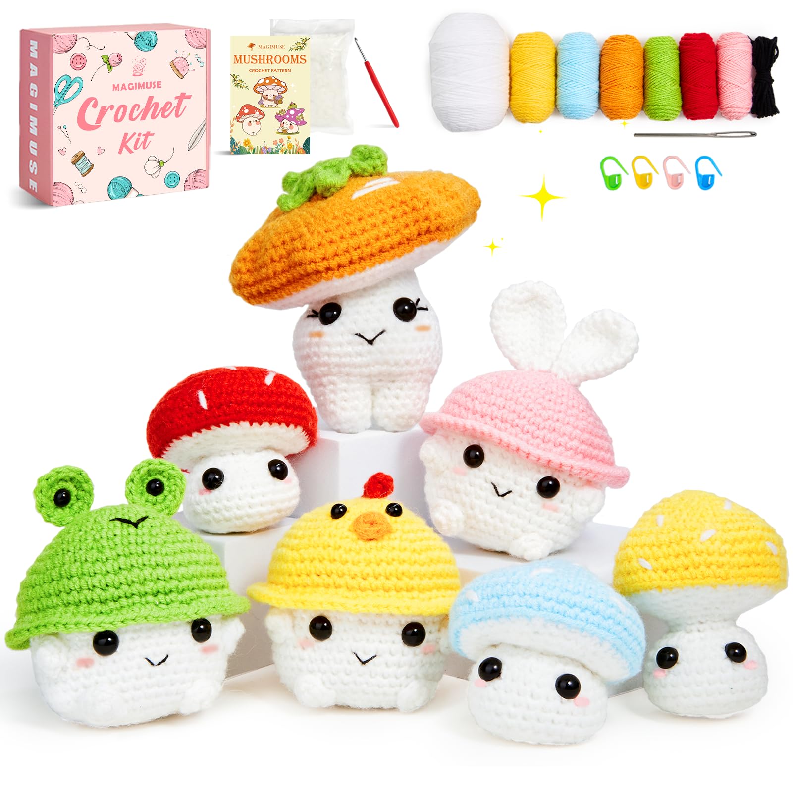 - 🍄All-In-One Crochet Starter Kit: MAGIMUSE crochet kits comes with everything you need to create adorable mushrooms, includes beginner-friendly instruction and video, enough 8 color yarn, stuffing, eyes, ergonomic Crochet Hook, yarn needle and stitch marker. With all the necessary tools conveniently packaged together, you can save time and effort by not having to search for each component individually.