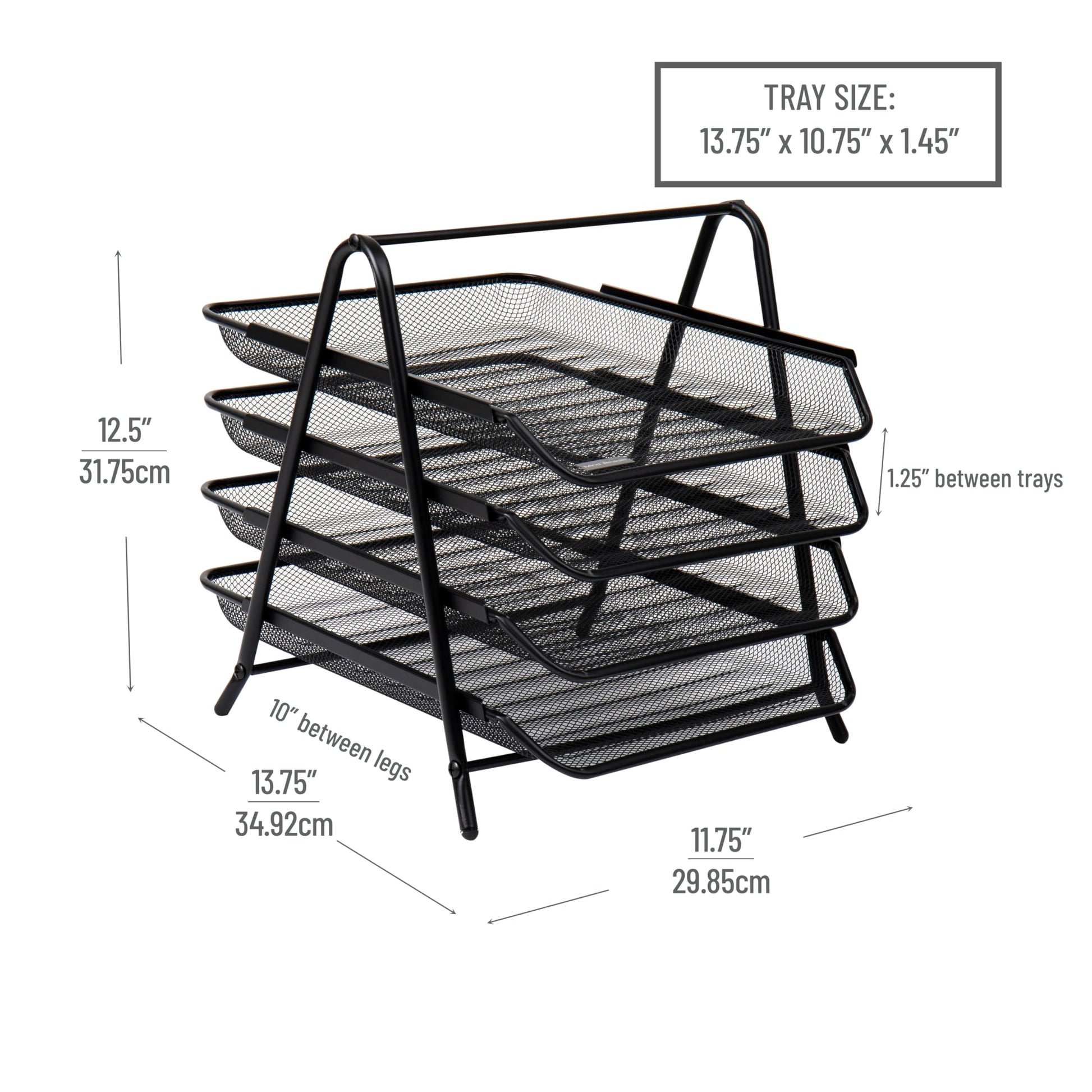 4-Tier Paper Tray, Desktop Organizer, File Storage, Workspace, Office, Metal Mesh, 11.75"L x 13.75"W x 12.5"H, Black