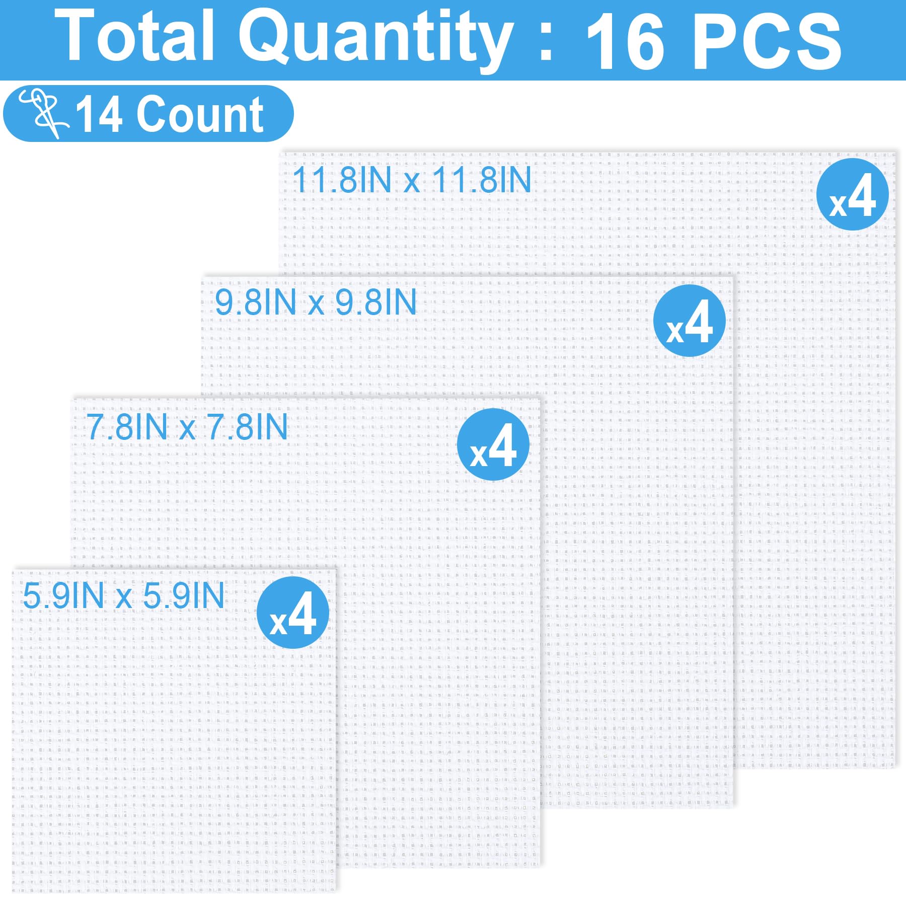 - 【4 Sizes】Package Includes 4 sizes, 5.9 x 5.9 inch, 7.8 x 7.8 inch, 9.8 x 9.8 inch, 11.8 x 11.8 inch. Each size has 4 pieces, a total of 16 pieces. Multiple sizes and sufficient quantities to meet your need. 14 count aida cloth has clear grid layout and a strong 3D touch feeling. You can cut cross stitch cloth freely by your need