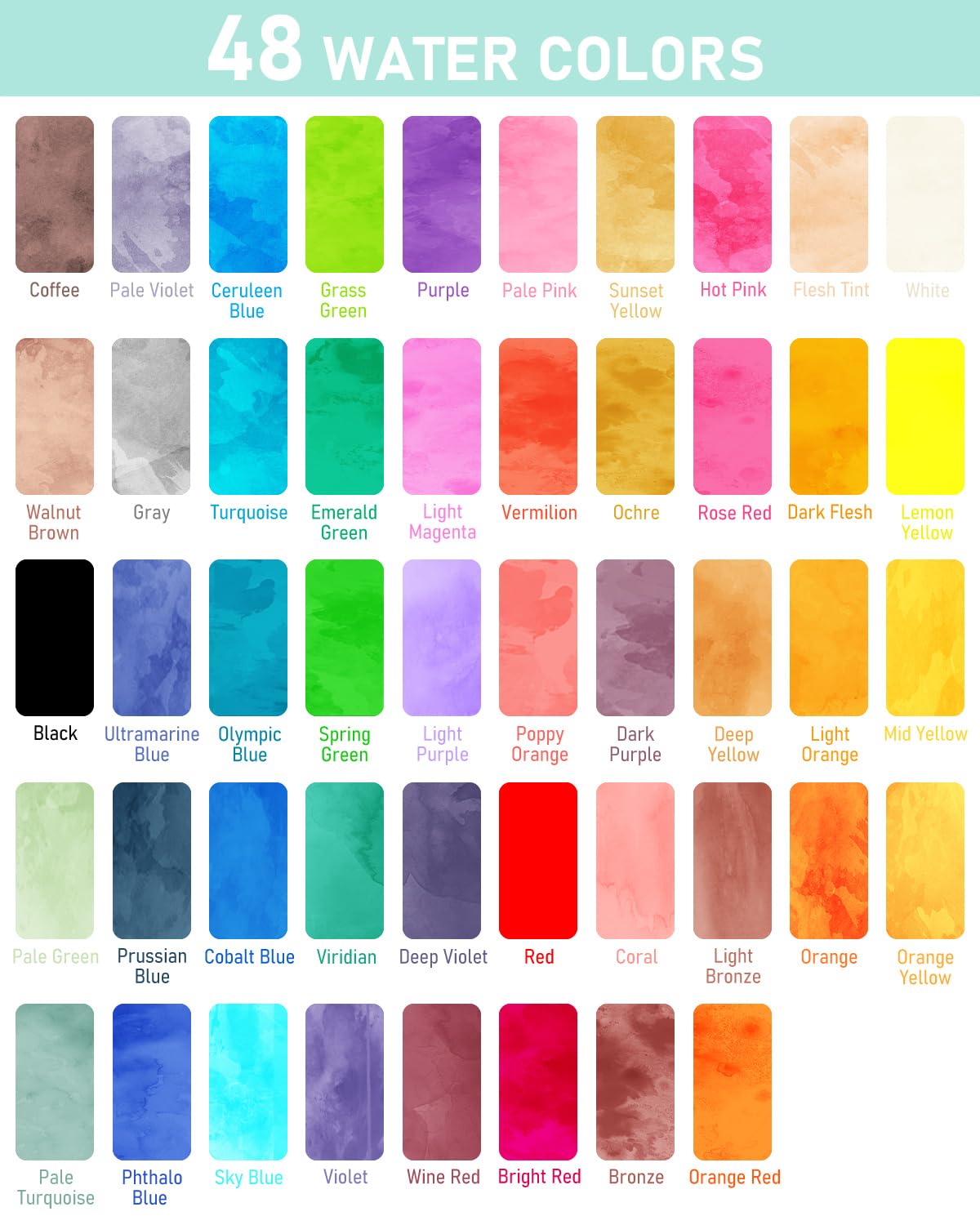 - 48 Rich Colors: This painting set contains a 48 paint palette including the primary colors and more.Easy to blend colors and dry fast, fading resistant and have excellent fluid.It is an ideal arts & crafts supply choice for outdoor sketching, creative interactive classroom activities, and other leisure art activities.