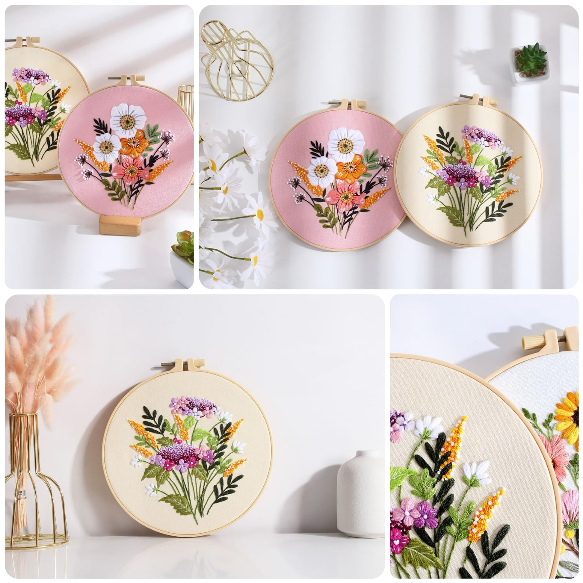 - 🌸 What's Included: Get everything you need in one set: 3 pieces of fabric with vibrant flower patterns, 1 embroidery hoops, a variety of vibrant color threads, 9 embroidery needles, easy-to-follow instructions, a pair of scissors, and 1 needle threader.