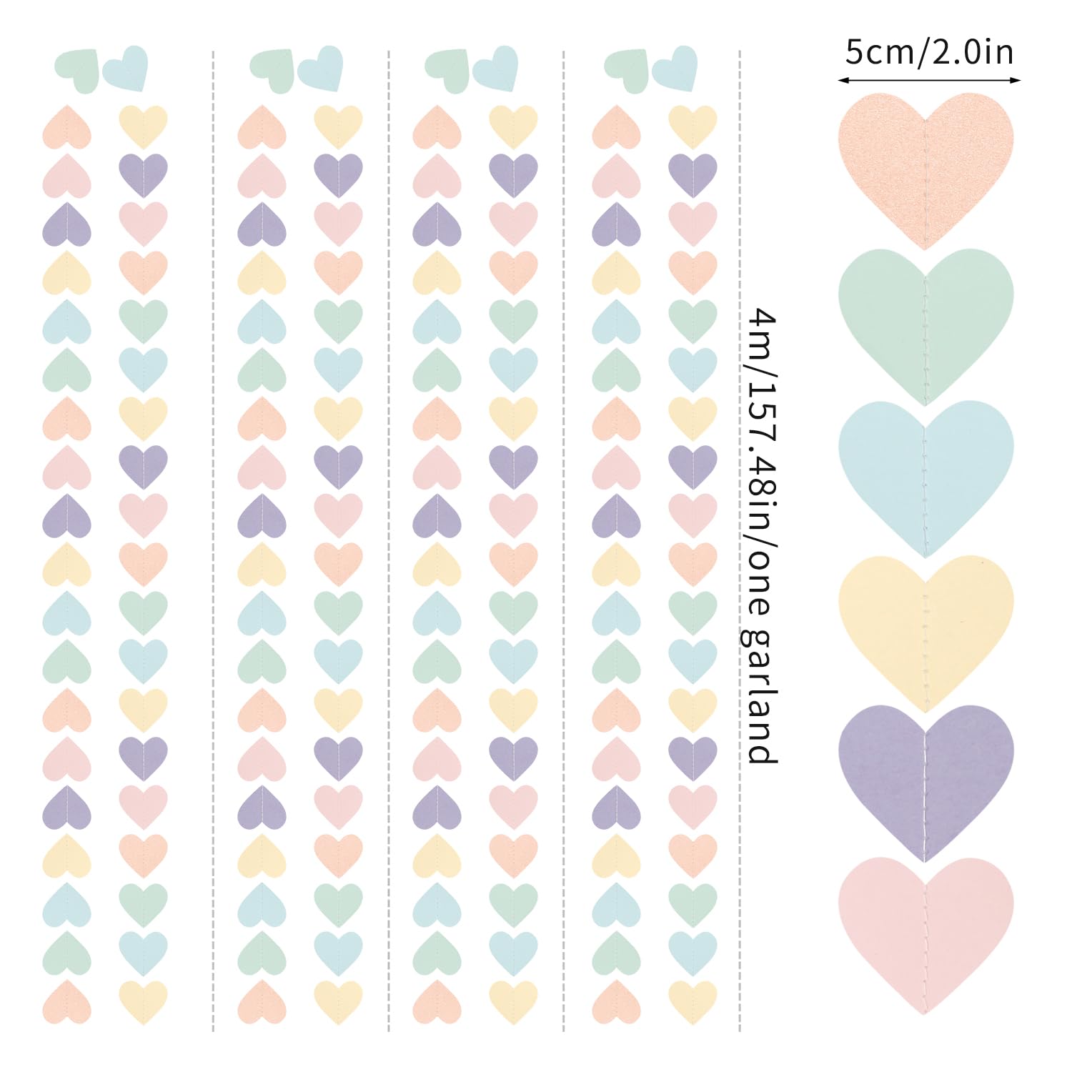 - PACKAGE CONTAINS: This set has four pastel rainbow paper heart garland,the length of each strand is 4 meters/13.1 feet, the total length is 16 meters/52.5 feet.The hearts are 2IN.