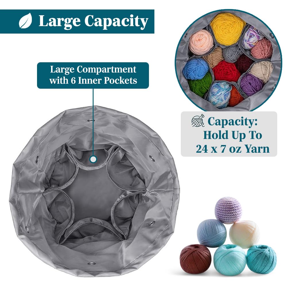 - CROCHET BAG ORGANIZER: Crochet yarn holder bag is a large capacity crochet organizer and storage that holds up to 24 x 7 oz yarn or 10-12 skeins of yarn. Spacious round crochet bag features a large interior with 6 pockets, offering convenient storage for yarn rolls, wool, fabric, and crafting supplies.