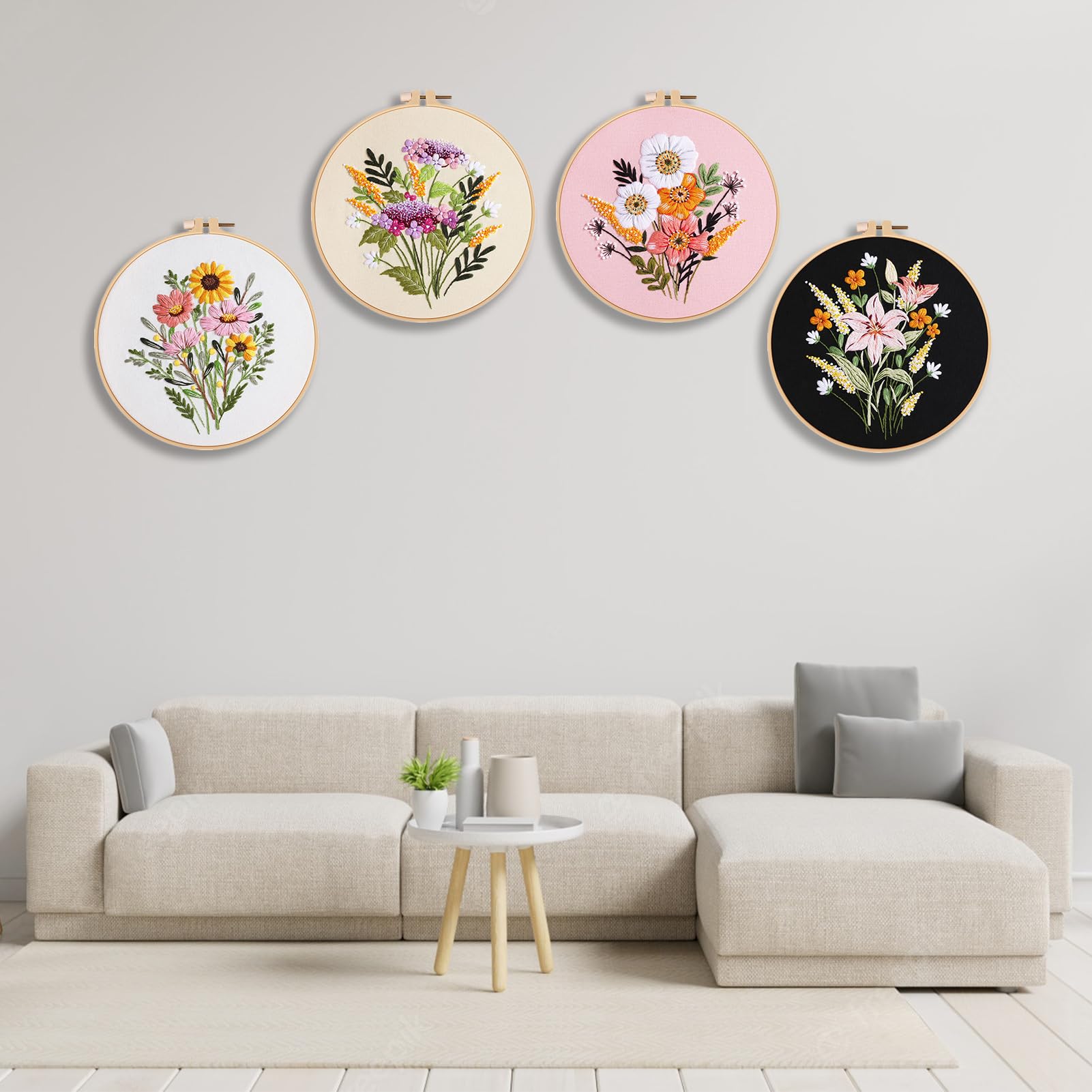 Flower Embroidery Kit for Beginners with Flower Pattern and Instructions,4 Pack Cross Stitch Kits,2 Wooden Embroidery Hoops,Threads and Needles,Needlepoint Kit for AdultsB0CB3X6M9M