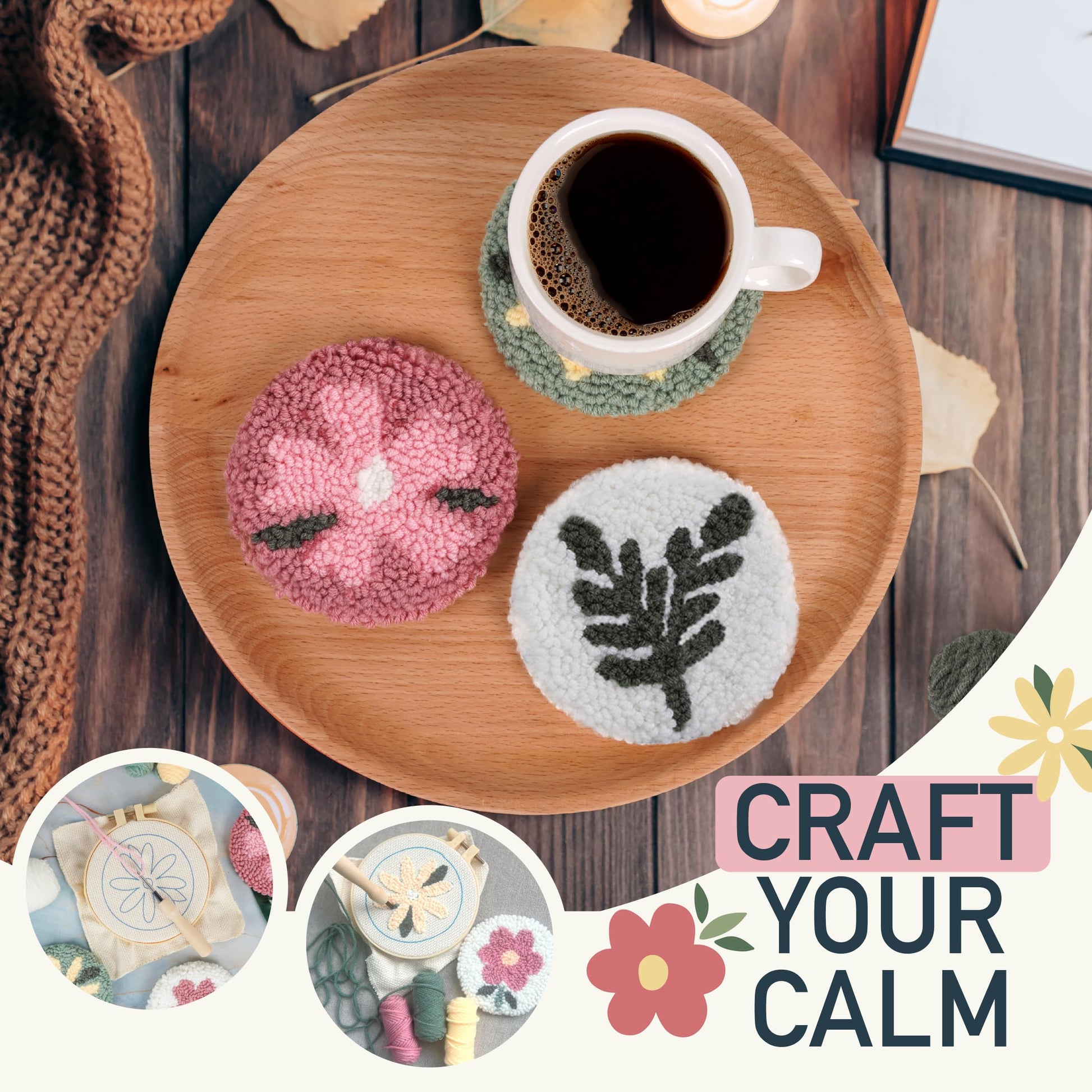 - ššØš§šÆšš§š¢šš§š šš§š ššØš¦š©š„ššš ššš: Our punch needle coaster kit includes pre-printed monk cloth with 6 floral designs, 2 wood punch needle tools, a plastic embroidery hoop, 2 threading tools, 6 adhesive felt backers, yarn, and detailed instructions. This beginner punch needle kit provides everything you need to master the craft and bring your creative visions to life.
