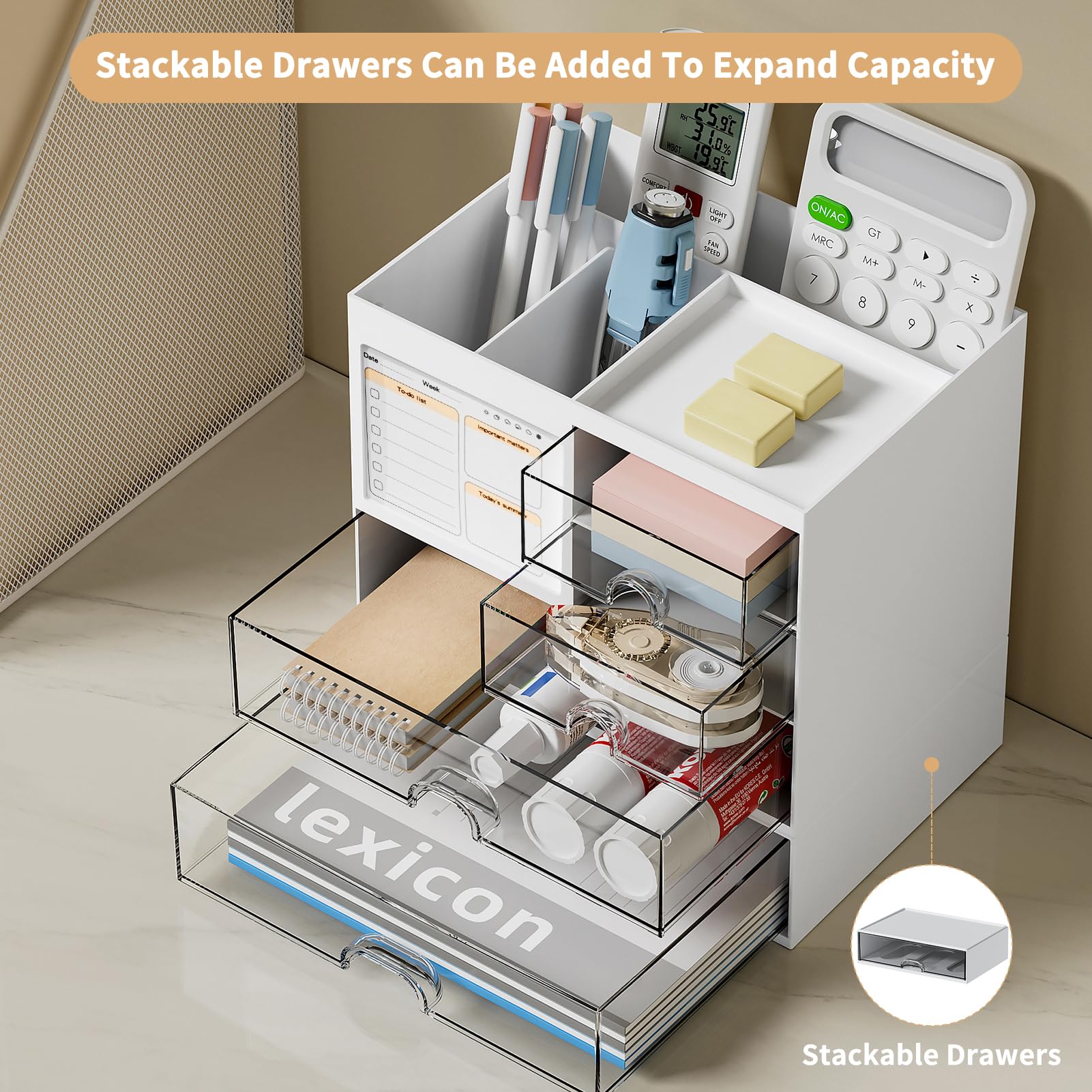 - ✏️【Expandable Capacity】Not only does the desk organizer have a large capacity, but it can also be expanded by adding stackable drawers. You can arrange and classify small office essentials such as iPad, pencils, markers, scissors, sticky notes, notebooks, paper clips, and more. It's perfect for organizing various office supplies and promoting an organized environment.