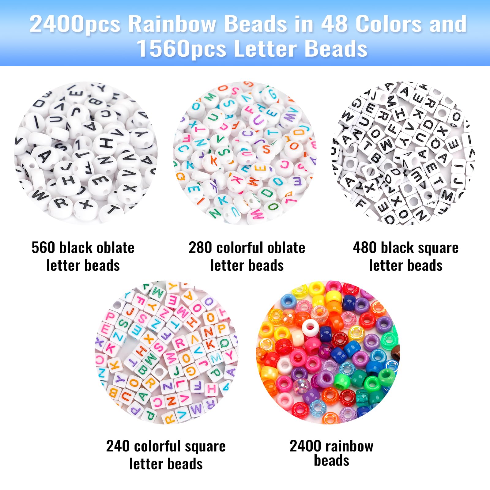 3960pcs Pony Beads for Friendship Bracelet Making Kit 48 Colors Kandi Beads Set, 2400pcs Plastic Rainbow Bulk and 1560pcs Letter Beads with 20 Meter Elastic Threads for Craft Jewelry Necklace