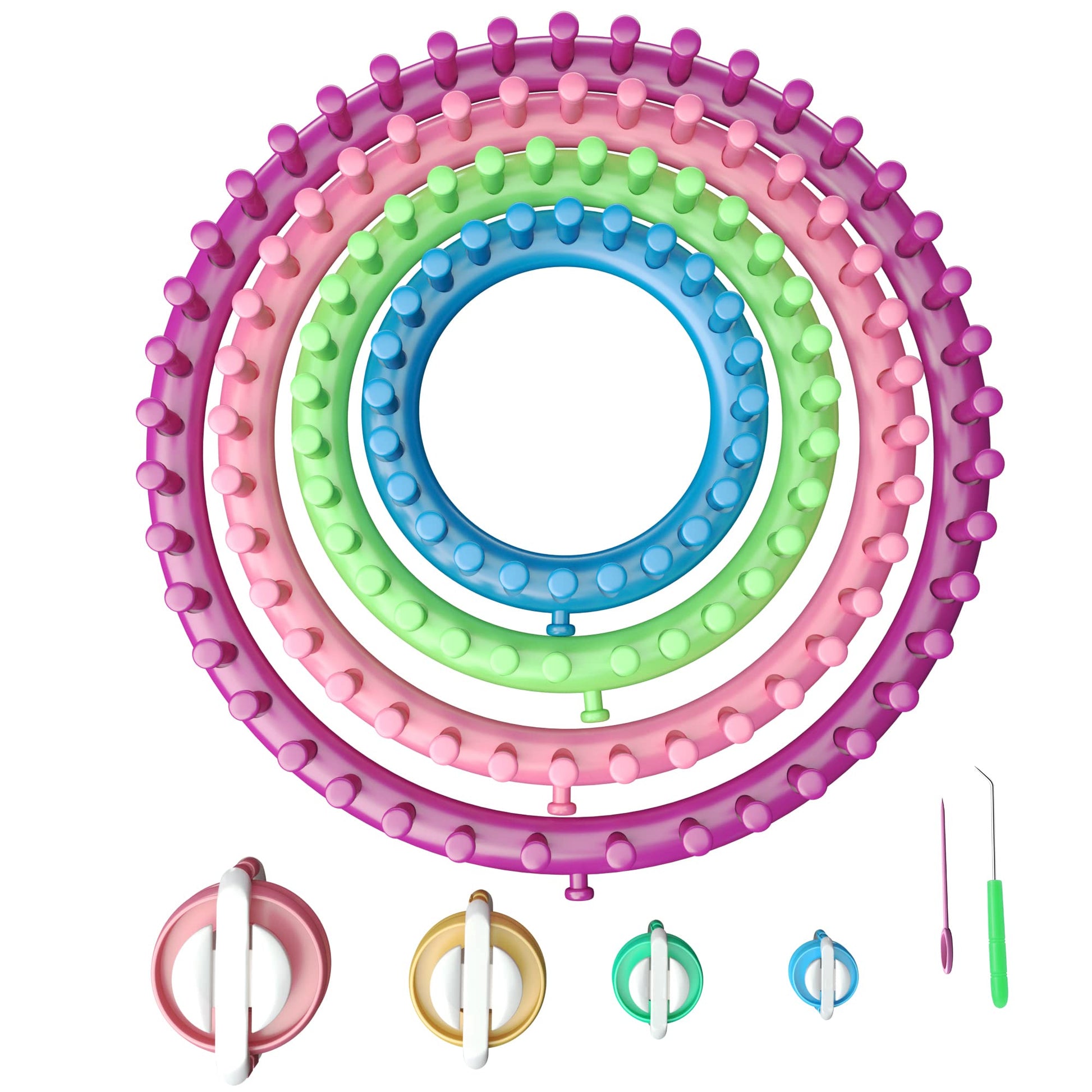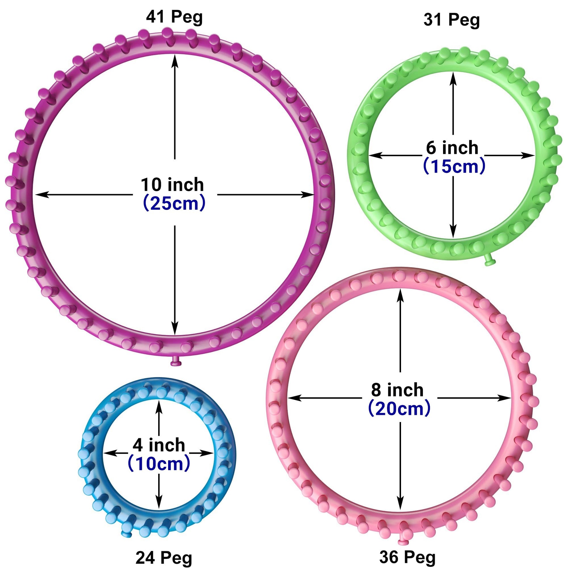 - Including: This kitting loom kit includes 4 different size of knitting looms (5/7/9/11 inches diameter), 1 hook, 1 yarn needle and 4 different size of pompom maker.