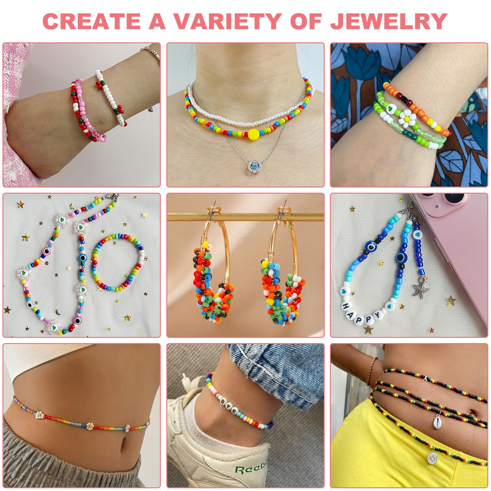 - ALL YOU NEED INCLUDED: A must for bracelet making lover. A box of about 3425pcs seed beads in 24 colors and 170pcs charms ( contains letter beads, evil eye beads, colorful heart beads, shells, pendants, jump rings, lobster clasps, etc.), 2pcs beading needles,2 roll elastic strings, a scissors and 1pcs tweezer as well as their own storage space, to meet all your needs for bracelets making & jewelry making.