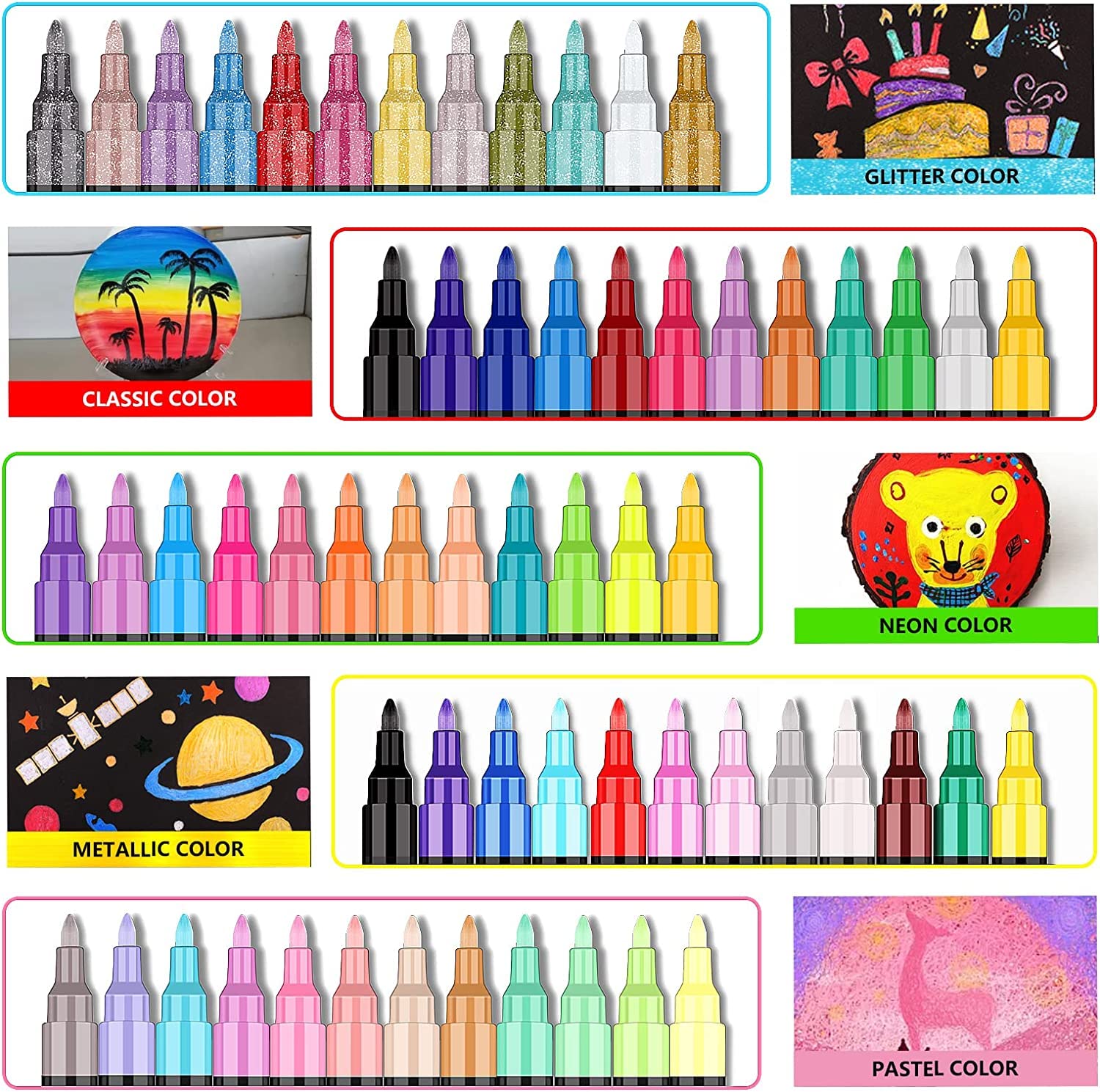 - Rich Colors:60 colors acrylic pens includes both 5 type style color: NEON、GLITTER、METALLIC、PASTEL、CLASSIC. The rich colors allow you to only need to carry this set when you face most of the creations, and you don't need to carry several sets.