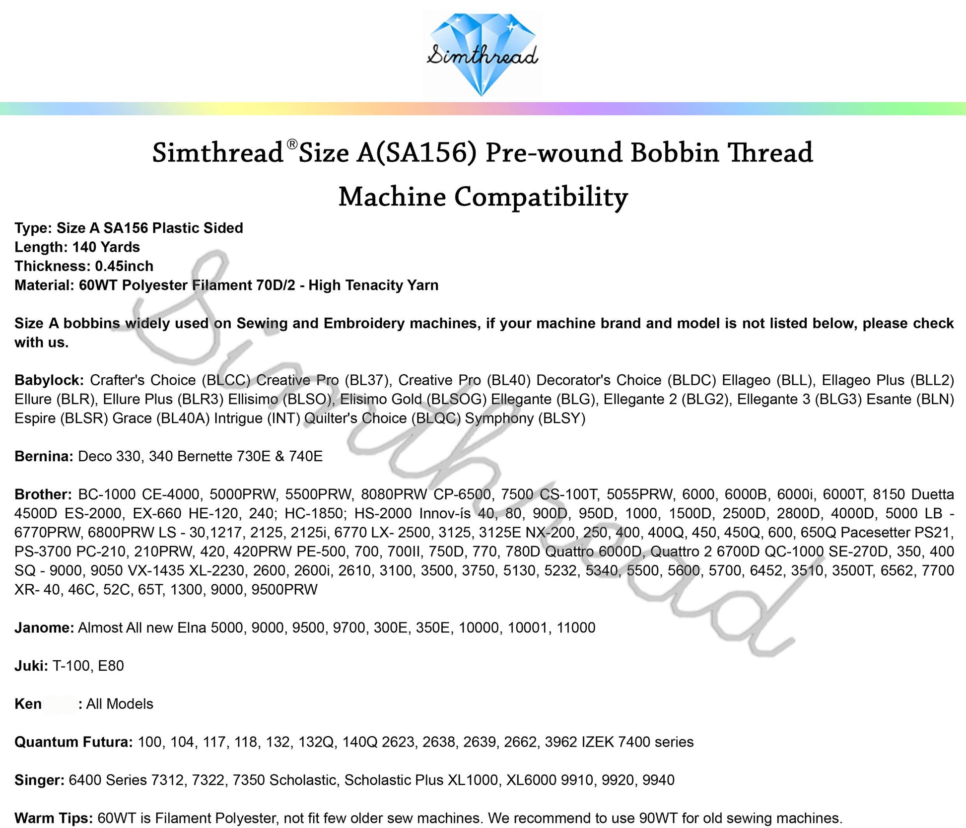 - ✔ SIMTHREAD brand is always your first choice of White Black Prewound Bobbin Thread for embroidery and sewing, 100% QUALITY GUARANTEE! Scroll down to Product Description to check the machine compatibility.