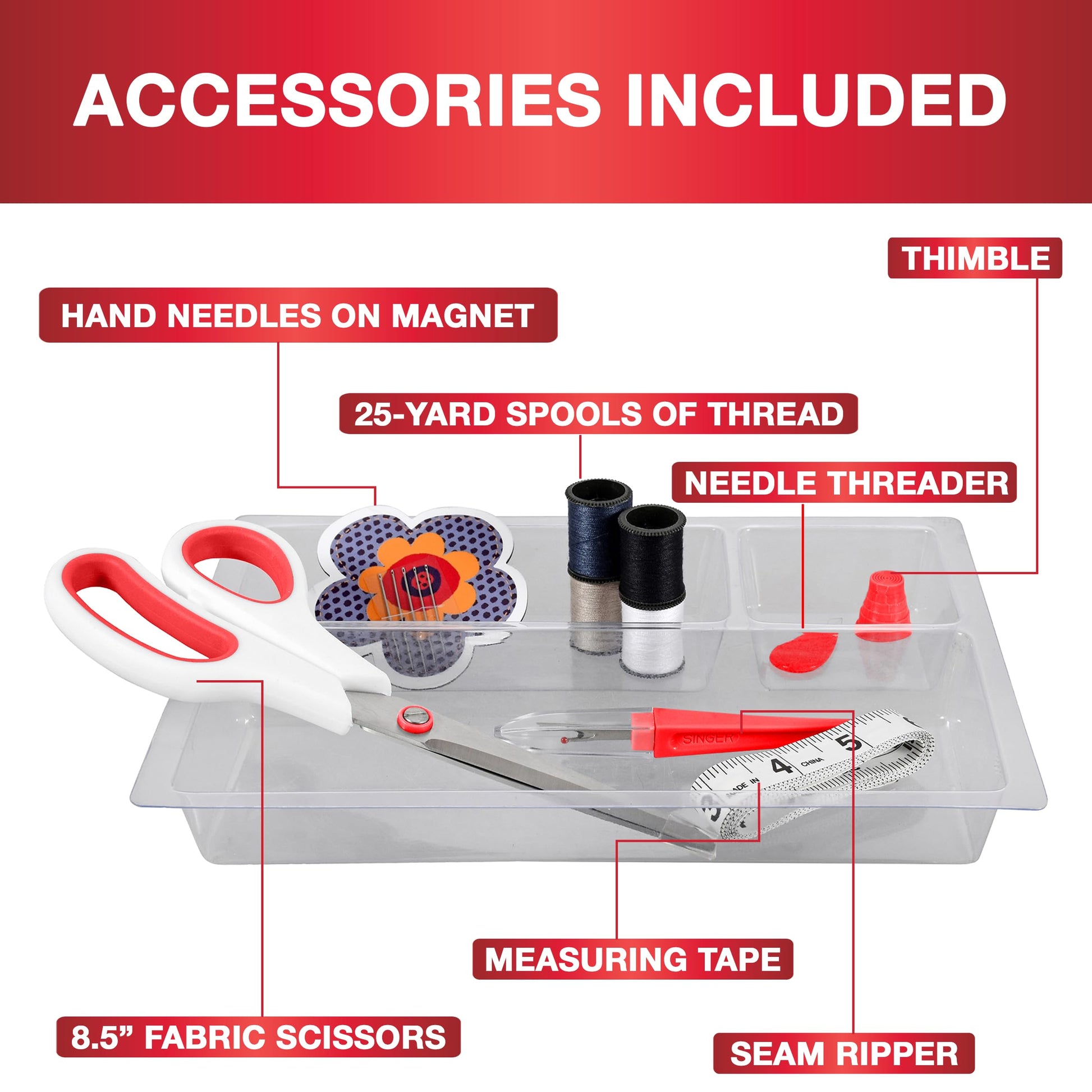 - Sewing kit includes offers a tape measure, deluxe seam ripper, four 25-yard spools of thread, 8.5" comfort fabric scissors, needle threader, thimble, needles on magnet matching the basket print