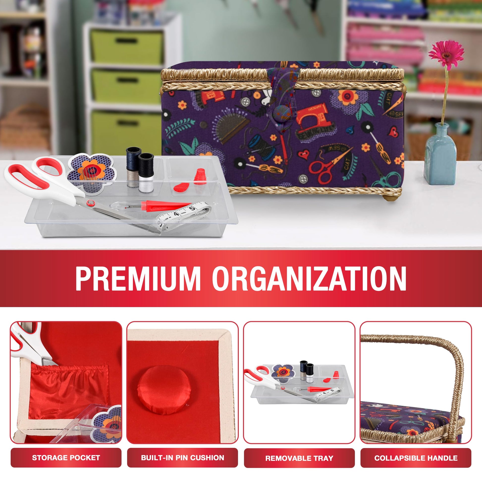 Sewing Basket with Sewing Kit, Needles, Thread, Scissors, and Notions- Purple