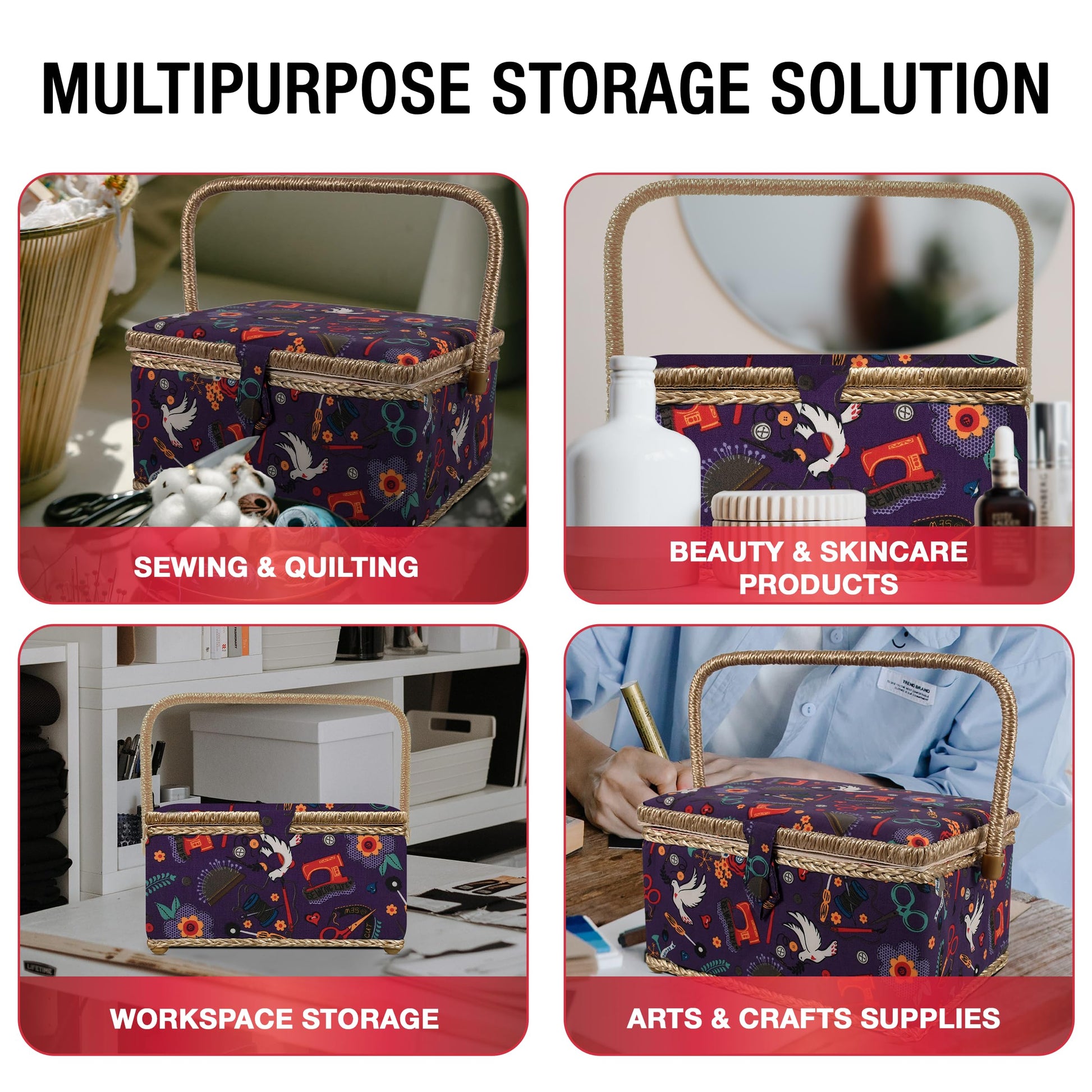 - Sewing organizer measures 10.25” x 7.5” and stands 6” tall (excluding handle), providing a roomy main storage compartment as well as a removable tray insert to keep needles, thread, sewing notions, and tools neat and organized