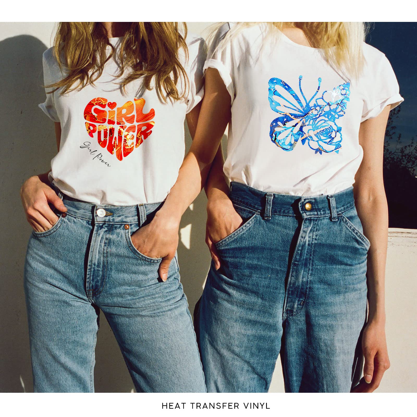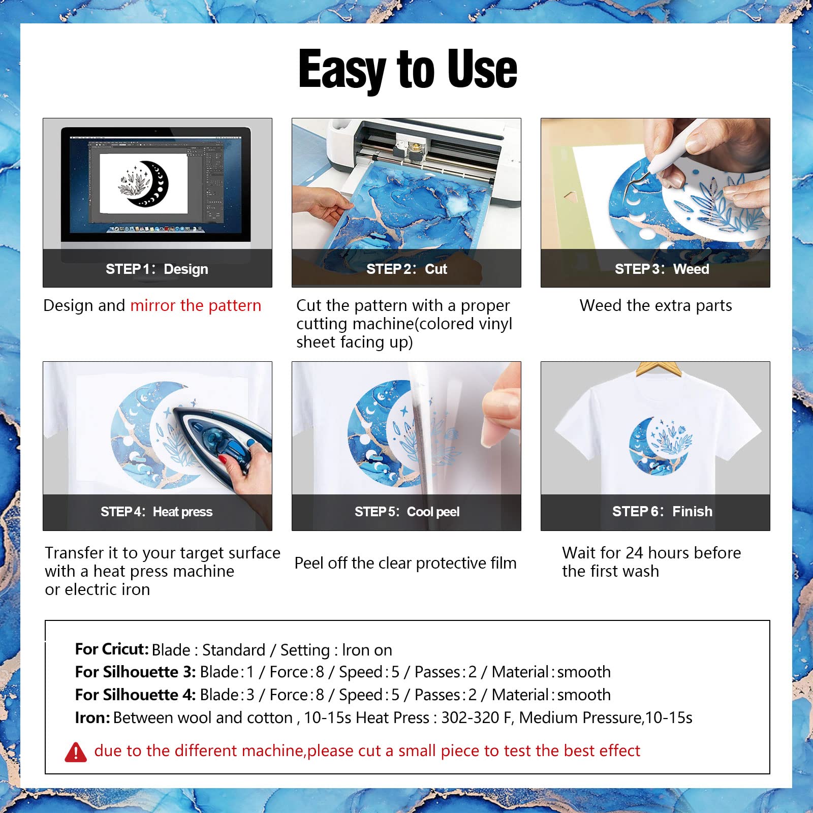 - Cut & Weed & Transfer Easily: Our pattern heat transfer vinyl bundles are very heat and pressure sensitive so transferring is quick and easy. Our HTV is more elastic, safe and easy to cut. You only need to design the pattern you like, then cut the pattern with a machine, and use a tool to remove the excess gradient vinyl. Finally, paste the engraved pattern on the clothes, heat press for a while, and after peeling off the protective film, you will get a unique heat transfer clothing