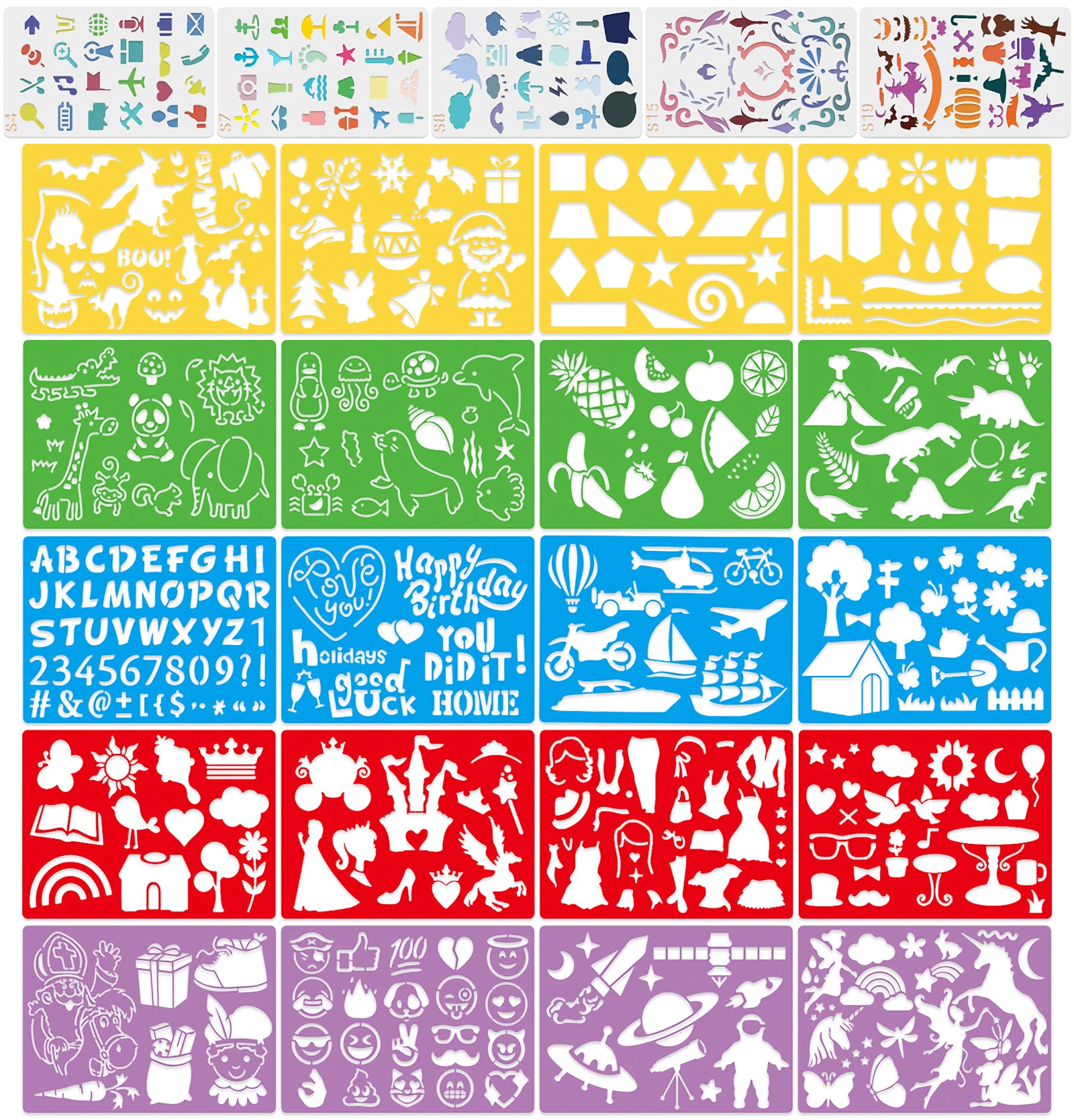 - [Rich Patterns] 25 Sheets drawing stencils with a variety of drawing options, include letters, animal, the sea-world, dinosaurs, planes, flower, weather and special Halloween, Christmas stencils.