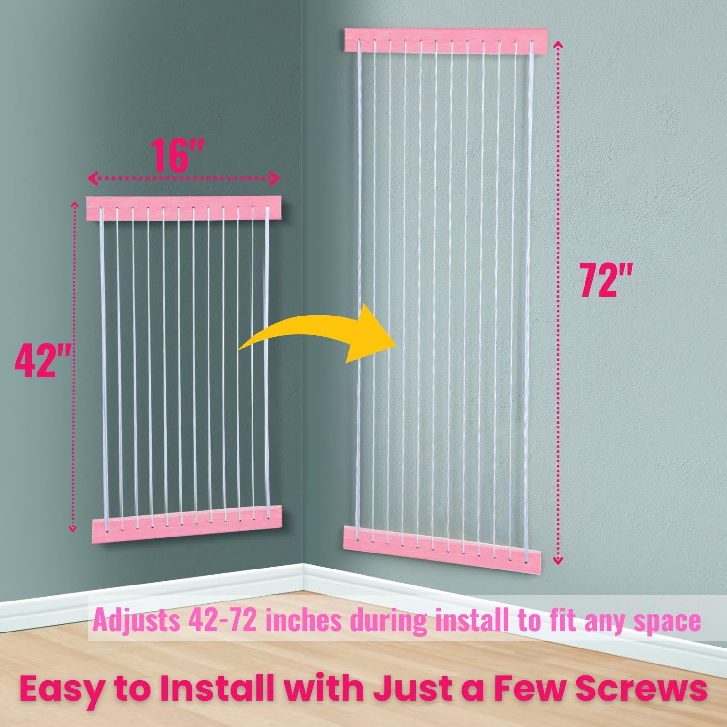 - 【Maximize Nursery Space with Cute and Functional Storage】 Perfect for busy parents, our hanging organizer is made from durable pine wood and elastic cords, helping keep your child's room tidy and charming. Easily mountable on any wall or wooden door, it expands from 42 to 72 inches to hold more stuffed animals. Ideal for displaying plushies, this space-saving solution enhances room decor while keeping toys accessible and organized.