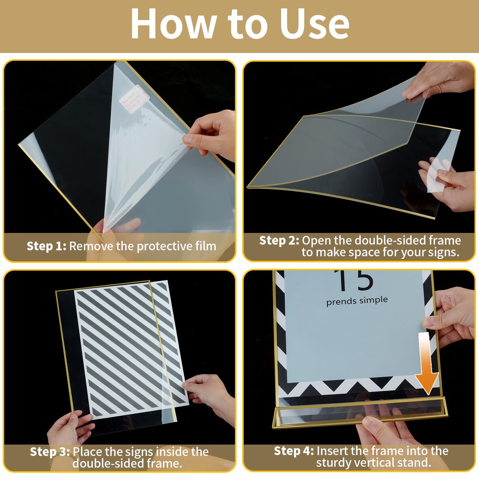 - 🌸【Elegant & Stable Gold Gold Sign Holder】With dimensions of 4x6 inches, featuring gold borders, it enhances the elegance and style of each table, making it suitable for both formal and casual occasions. Each frame comes with a spacious, stable triangular base, ensuring secure vertical placement on tabletops that is easy to set up and dismantle.