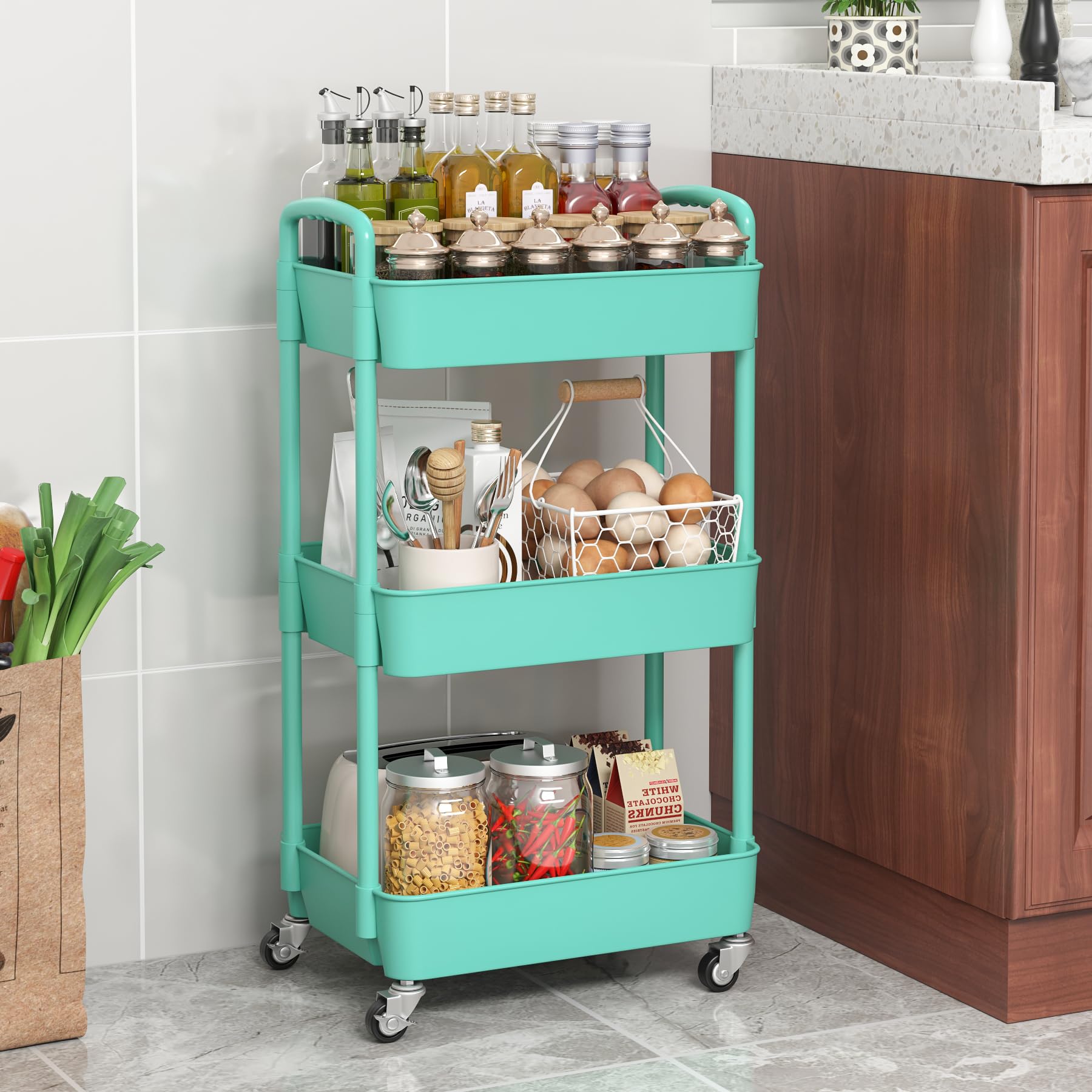 3-Tier Plastic Rolling Utility Cart with Handle, Multi-Functional Storage Trolley for Office, Living Room, Kitchen, Movable Storage Organizer with Wheels, Green