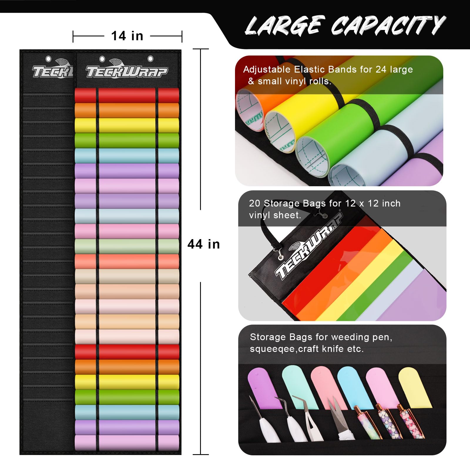 - ADJUSTABLE ELASTIC BANDS, DOUBLE-SIDED USE. Large capacity meets all your daily needs! Adjustable elastic bands in front are specially for easily putting vinyl in and out, fit up to 24 large & small vinyl rolls.20 storage bags in the back are perfect for keeping vinyl sheets, tools, accessories, etc.