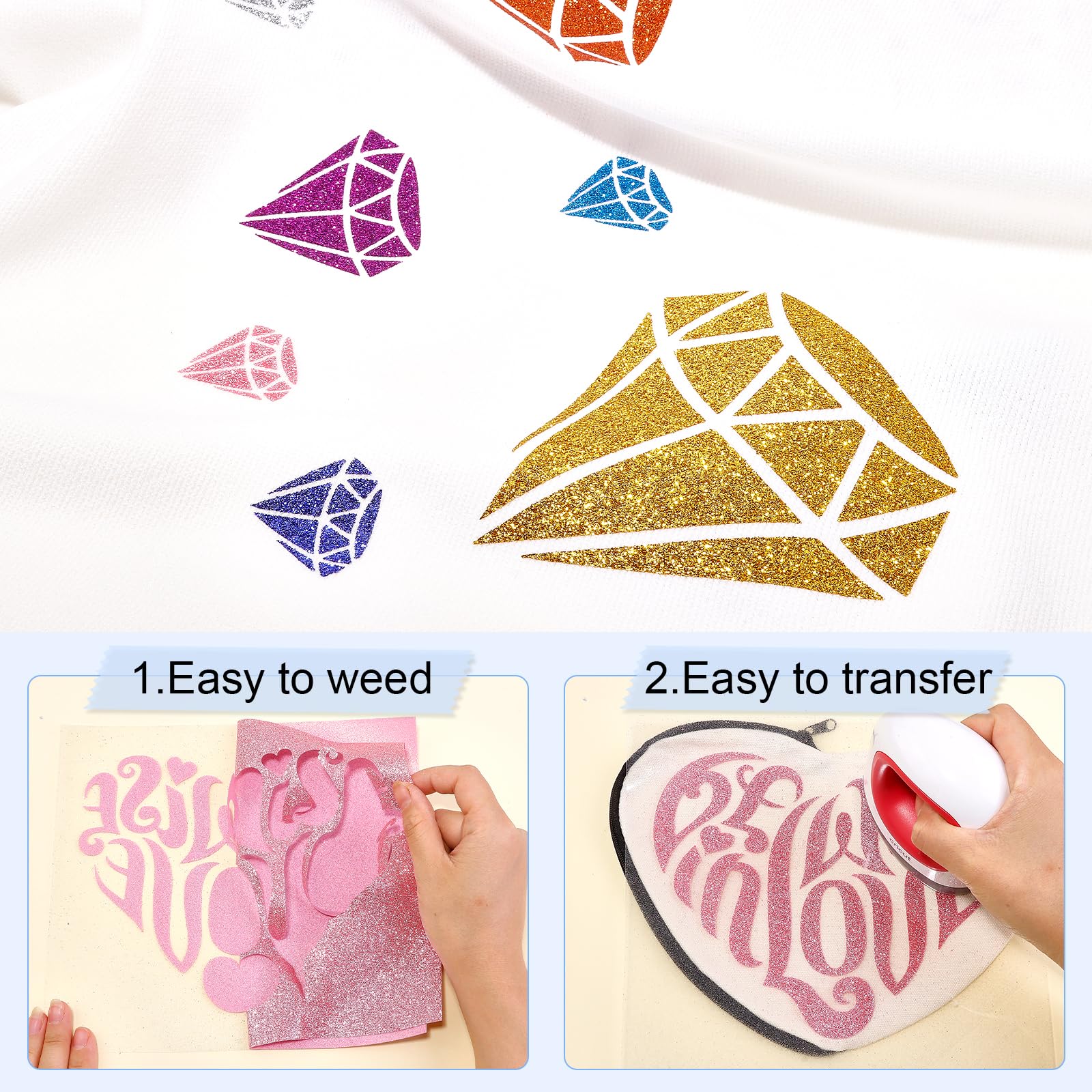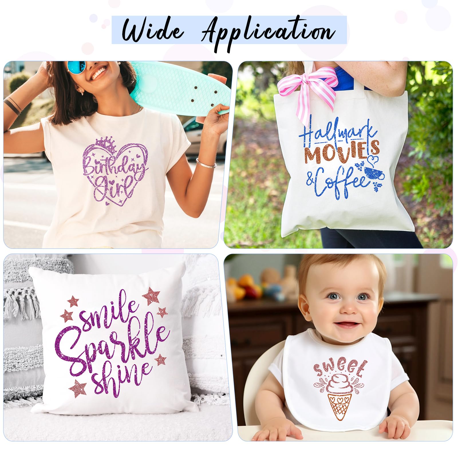 - 【Long-Lasting】The ultra-thin design of the glitter heat transfer vinyl provides great elasticity and stretchability. It can withstand repeated washing and natural body movements, ensuring that it stays on your fabric and does not peel off, crack, or fade.
