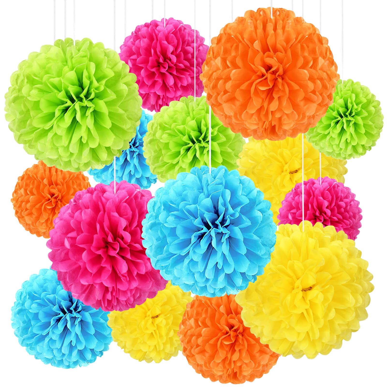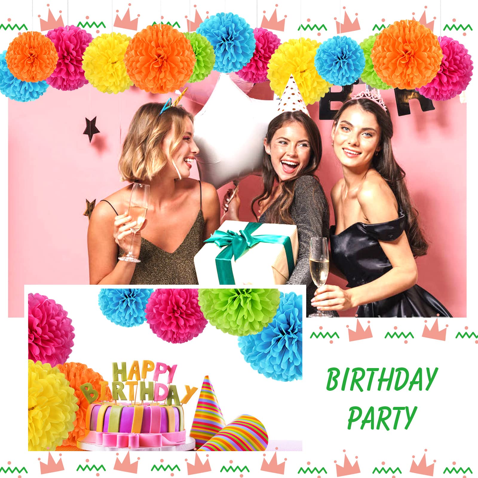 - 1.The party decor kit include 15pcs colorful tissue paper poms :5 color(blue,pink,yellow,green, orange),3 Pieces of each color, each color with 3 different sizes(14inch, 12inch, 10inch)