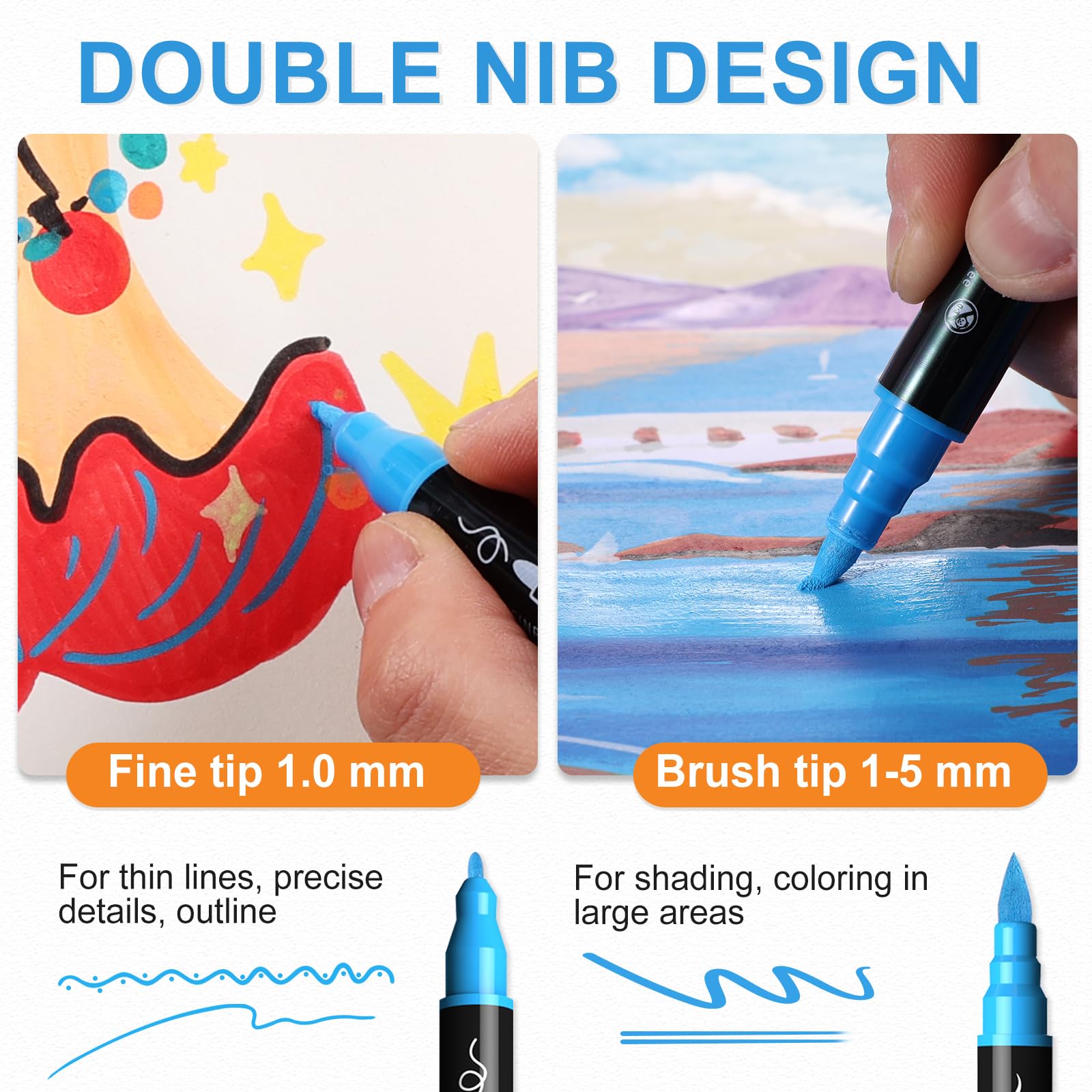 - Versatile Dual Tip: Our acrylic paint markers feature a unique dual-tip design to meet various needs. The 1mm fine tip is perfect for outlining and adding intricate details, while the 1-5mm brush tip is designed for covering large areas.By adjusting brush pressure, you can create different strokes without the hassle of changing nibs, making your creative process more convenient. Whether you're a beginner or a professional, you can fully unleash your creativity!