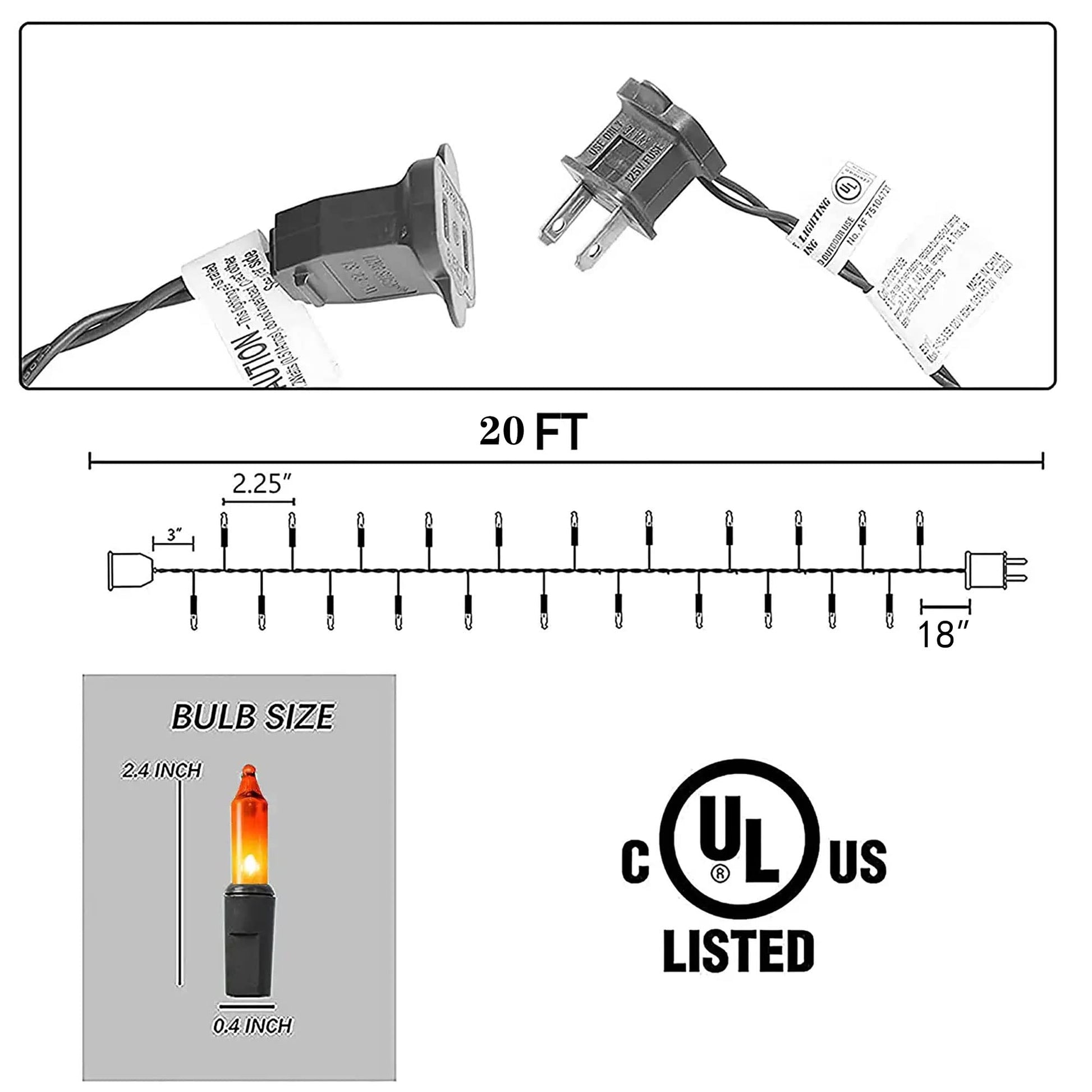 - Charming Halloween Lights: Package include 1 x 20ft mini string light, 1 x spare fuse, 4 spare incandescent bulbs. The lighted length of Halloween clear string light is 18.5 ft, the leading wire is 1.5 ft, and the bulb space is 2.25 inch, work voltage of each bulb is 2.5V / 0.42W, safety with built in 3A fuse.
