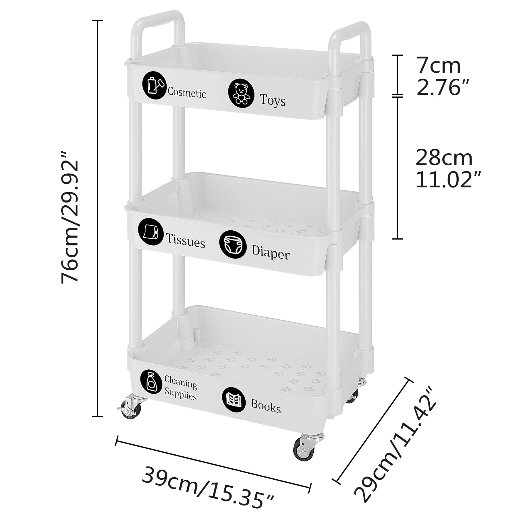 3-Tier Rolling Utility Cart with 12 Category Labels,Multifunctional Storage Shelves with Handle and Lockable Wheels for Room,Office,Kitchen,Bathroom,White